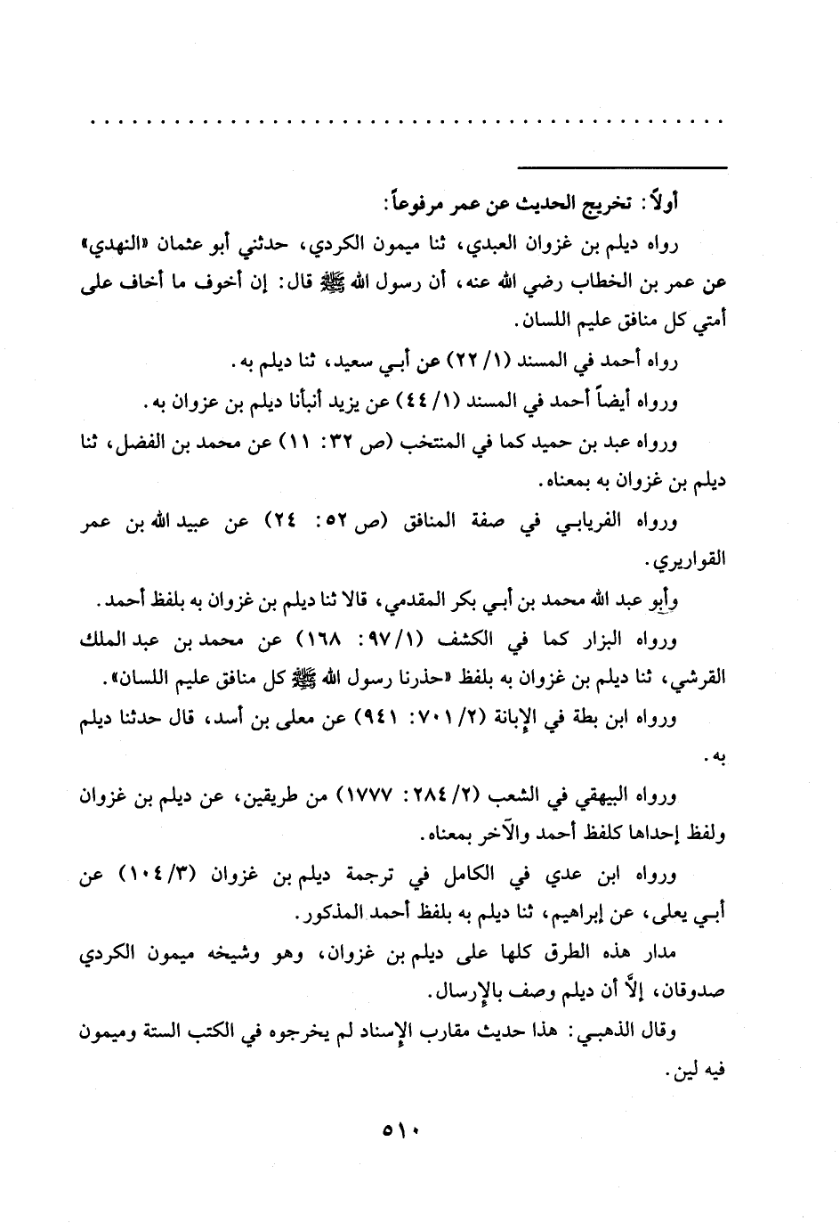 رواه ديلم بن غزوان العبدي، ثنا ميمون الكردي، حدثني أبو عثمان "النهدي" عن عمر بن الخطاب رضي الله عنه، أن رسول الله -صلى الله عليه وسلم- قال: إن أخوف ما أخاف على أمتي كل منافق عليم اللسان.
