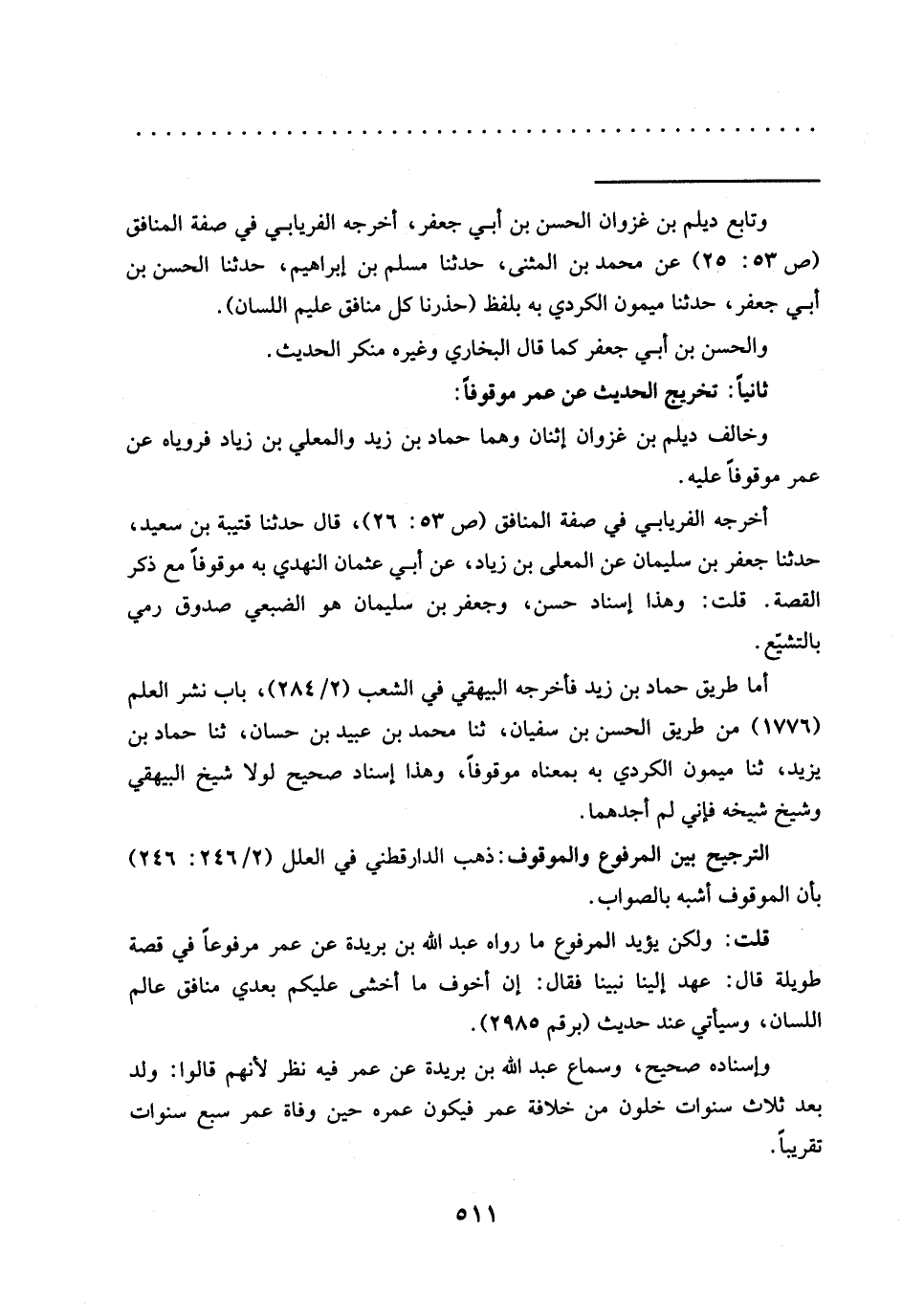 وخالف ديلم بن غزوان إثنان وهما حماد بن زيد والمعلي بن زياد فروياه عن عمر موقوفًا عليه.