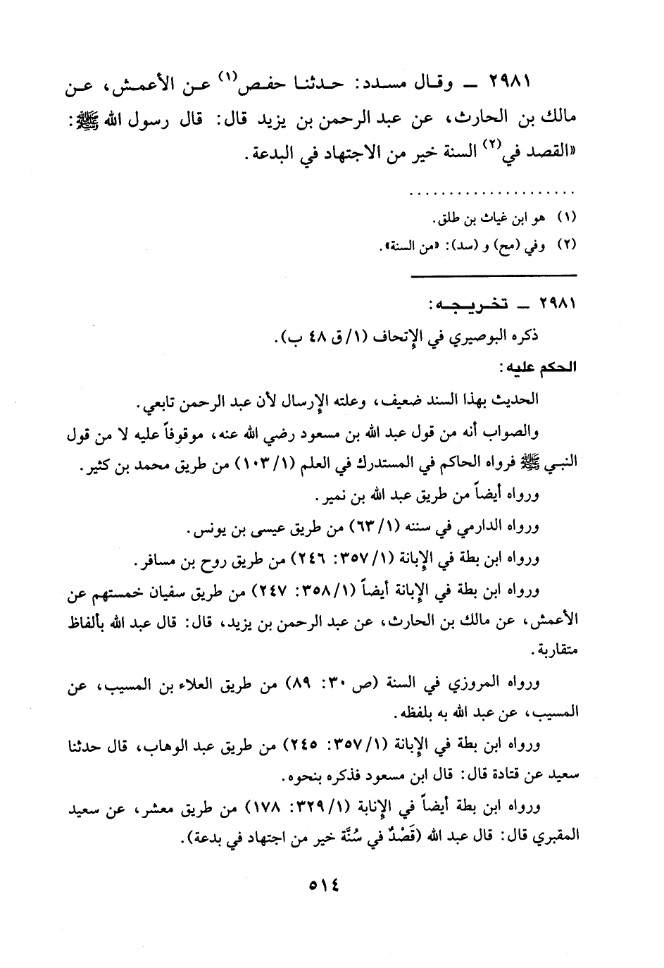 2981 - وَقَالَ مُسَدَّدٌ: حَدَّثَنَا حَفْصٌ عَنِ الْأَعْمَشِ، عَنْ مَالِكِ بْنِ الْحَارِثِ، عَنْ عَبْدِ الرَّحْمَنِ بْنِ يَزِيدَ قَالَ: قَالَ رَسُولُ اللَّهِ صَلَّى اللَّهُ عَلَيْهِ وَسَلَّمَ: " §الْقَصْدُ فِي السُّنَّةِ خَيْرٌ مِنَ الِاجْتِهَادِ فِي الْبِدْعَةِ.