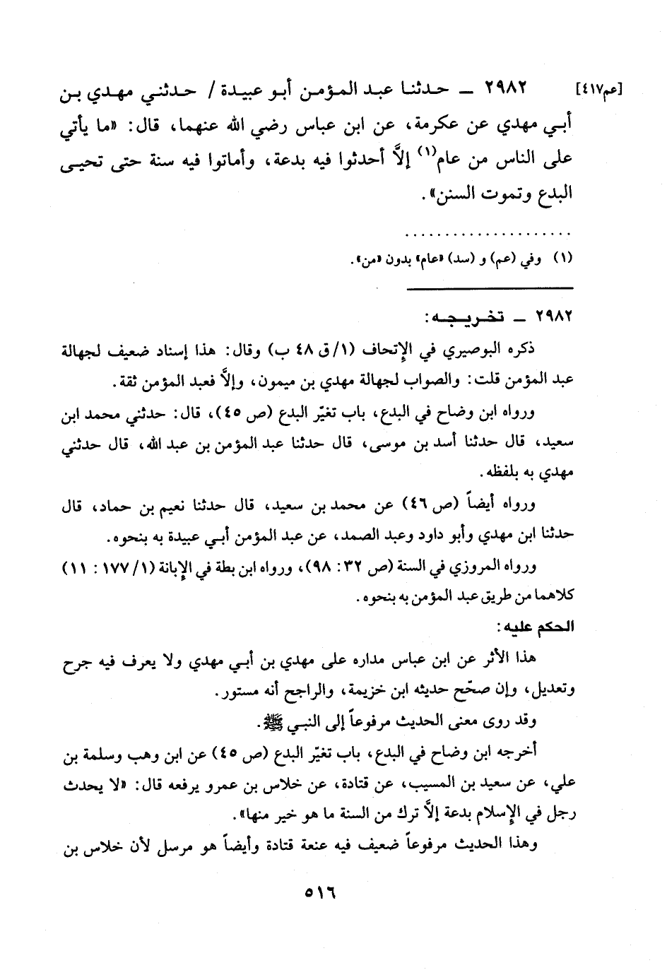 2982 - حَدَّثَنَا عَبْدُ الْمُؤْمِنِ أَبُو عُبَيْدَةَ / حَدَّثَنِي مَهْدِيُّ بْنُ أَبِي مَهْدِيٍّ عَنْ عِكْرِمَةَ، عَنِ ابْنِ عَبَّاسٍ رَضِيَ الله عَنْهُمَا، قَالَ: " §مَا يَأْتِي عَلَى النَّاسِ مِنْ عَامٍ إِلَّا أَحْدَثُوا فِيهِ بِدْعَةً، وَأَمَاتُوا فِيهِ سُنَّةً حَتَّى تحيى الْبِدَعُ وَتَمُوتَ السُّنَنُ ".