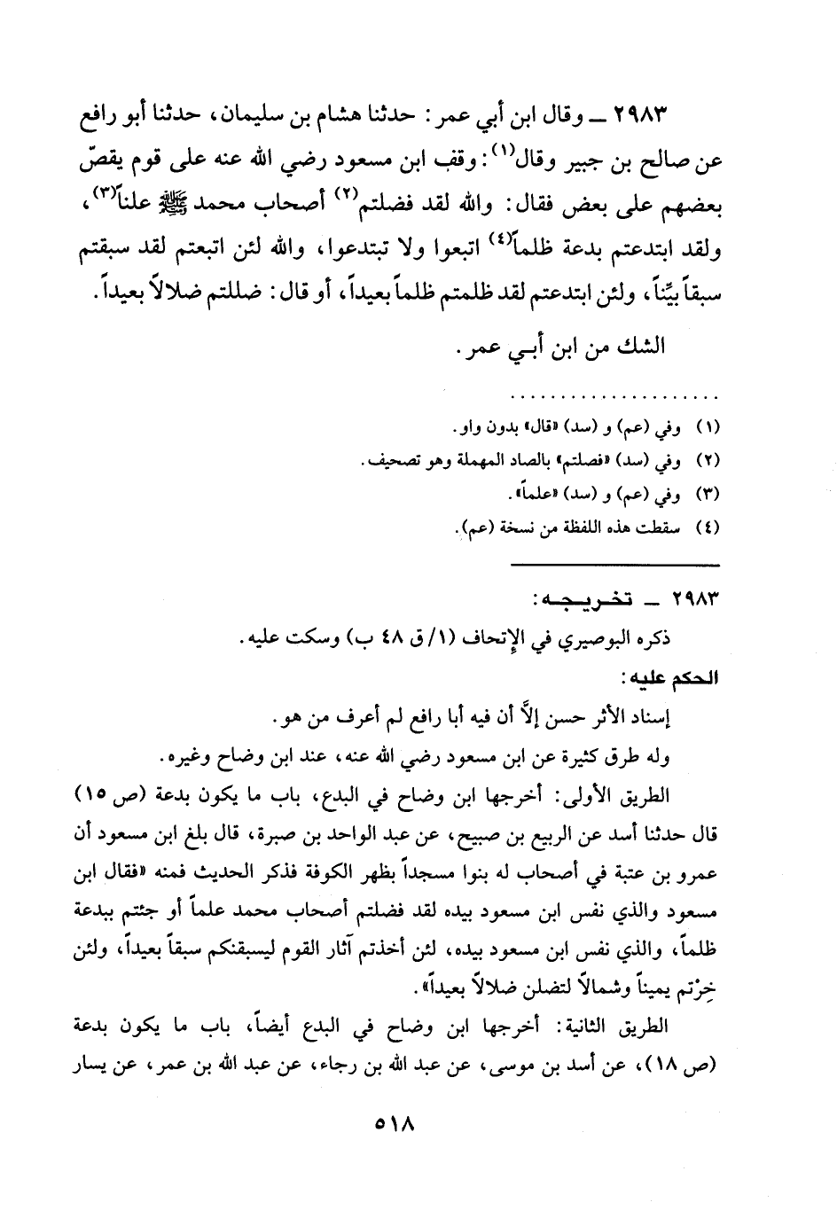 2983 - وَقَالَ ابْنُ أَبِي عُمَرَ: حَدَّثَنَا هِشَامُ بْنُ سُلَيْمَانَ، حَدَّثَنَا أَبُو رَافِعٍ عَنْ صَالِحِ بْنِ جُبَيْرٍ وقال: وَقَفَ ابْنُ مَسْعُودٍ رَضِيَ الله عَنْهُ عَلَى قَوْمٍ يَقُصُّ بَعْضُهُمْ عَلَى بَعْضٍ فَقَالَ: وَاللَّهِ لَقَدْ فَضَلْتُمْ أَصْحَابَ مُحَمَّدٍ صَلَّى اللَّهُ عَلَيْهِ وَسَلَّمَ عَلَنًا، وَلَقَدِ ابْتَدَعْتُمْ بِدْعَةً ظُلْمًا، §اتَّبِعُوا وَلَا تَبْتَدِعُوا، وَاللَّهِ لَئِنِ اتَّبَعْتُمْ لَقَدْ سَبَقْتُمْ سَبْقًا بَيِّنًا، وَلَئِنِ ابْتَدَعْتُمْ لَقَدْ ظُلِمْتُمْ ظُلْمًا بَعِيدًا، أَوْ قَالَ: ضَلَلْتُمْ ضلالا بعيداً.