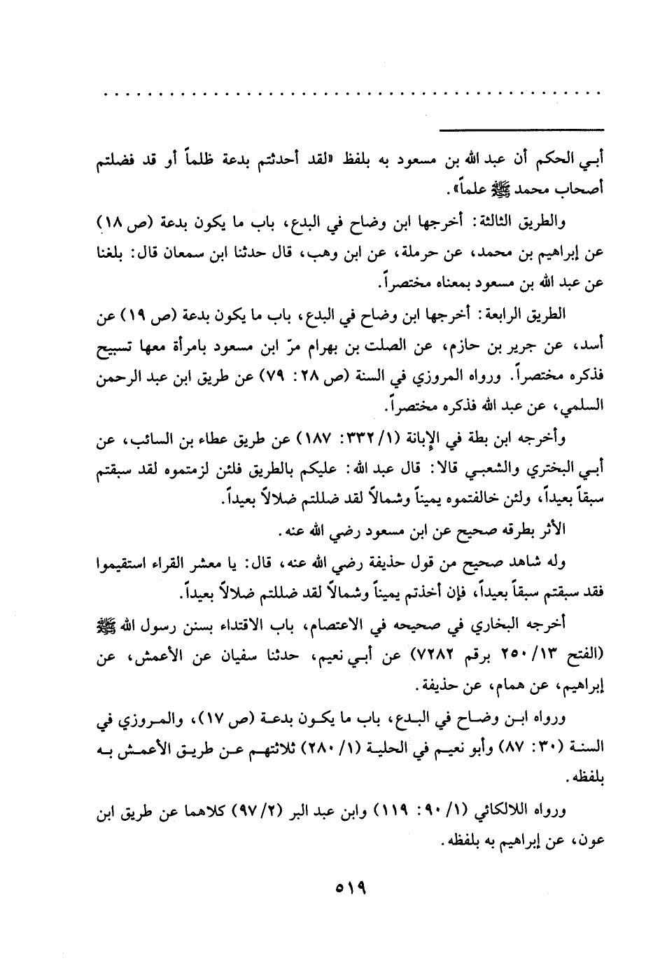 والطريق الثالثة: أخرجها ابن وضاح في البدع، باب ما يكون بدعة (ص 18) عن إبراهيم بن محمَّد، عن حرملة، عن ابن وهب، قال حدّثنا ابن سمعان قال: بلغنا عن عبد الله بن مسعود بمعناه مختصرًا.