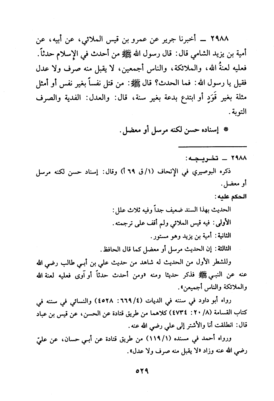 2988 - أَخْبَرَنَا جَرِيرٌ عَنْ عَمْرِو بْنِ قَيْسٍ الْمُلَائِيِّ، عَنْ أَبِيهِ، عَنْ أُمَيَّةَ بْنِ يَزِيدَ الشَّامِيِّ قَالَ: قَالَ رَسُولُ اللَّهِ صَلَّى اللَّهُ عَلَيْهِ وَسَلَّمَ §مَنْ أَحْدَثَ فِي الْإِسْلَامِ حَدَثًا. فَعَلَيْهِ لَعْنَةُ اللَّهِ، وَالْمَلَائِكَةِ، وَالنَّاسِ أَجْمَعِينَ، لَا يُقْبَلُ مِنْهُ صَرْفٌ وَلَا عَدْلٌ فَقِيلَ يَا رَسُولَ اللَّهِ: فَمَا الْحَدَثُ؟ قَالَ صَلَّى اللَّهُ عَلَيْهِ وَسَلَّمَ: مَنْ قَتَلَ نَفْسًا بِغَيْرِ نَفْسٍ أَوِ أَمْثَلَ مَثُلَةً بِغَيْرِ قَوَدٍ أَوِ ابْتَدَعَ بِدْعَةً بِغَيْرِ سُنَّةٍ، قَالَ: وَالْعَدْلُ: الْفِدْيَةُ وَالصَّرْفُ التَّوْبَةُ.