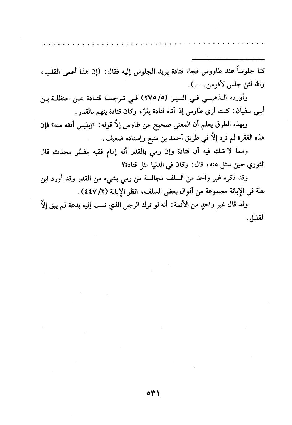 وأورده الذهبي في السير (5/ 275) في ترجمة قتادة عن حنظلة بن أبي سفيان: كنت أرى طاوس إذا أتاه قتادة يفرّ، وكان قتادة يتهم بالقدر.
