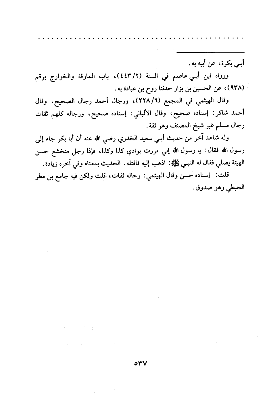 ورواه ابن أبي عاصم في السنة (2/ 443)، باب المارقة والخوارج برقم (938)، عن الحسين بن بزار حدّثنا روح بن عبادة به.