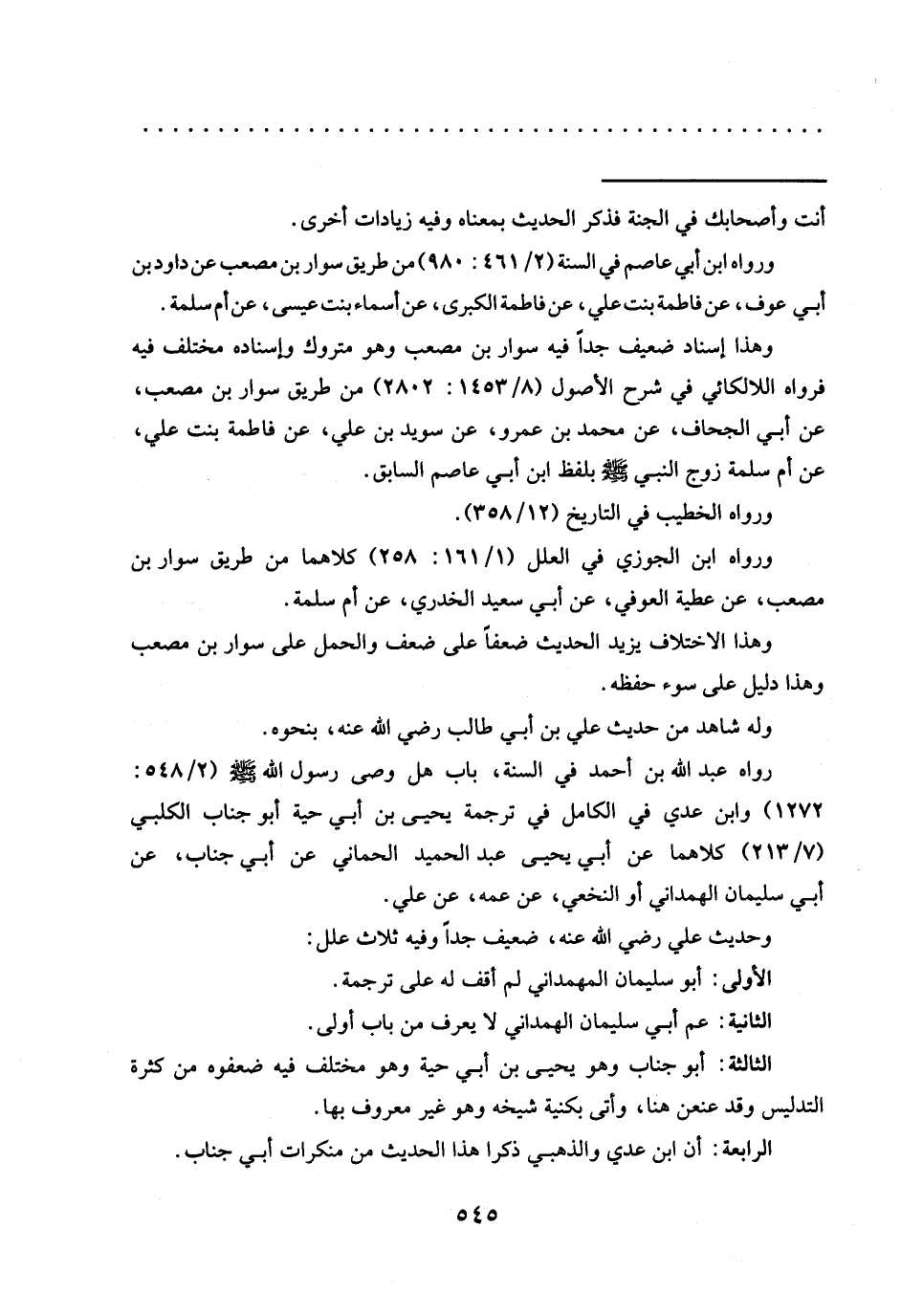 ورواه ابن الجوزي في العلل (1/ 161: 258) كلاهما من طريق سوار بن مصعب، عن عطية العوفي، عن أبي سعيد الخدري، عن أم سلمة.
