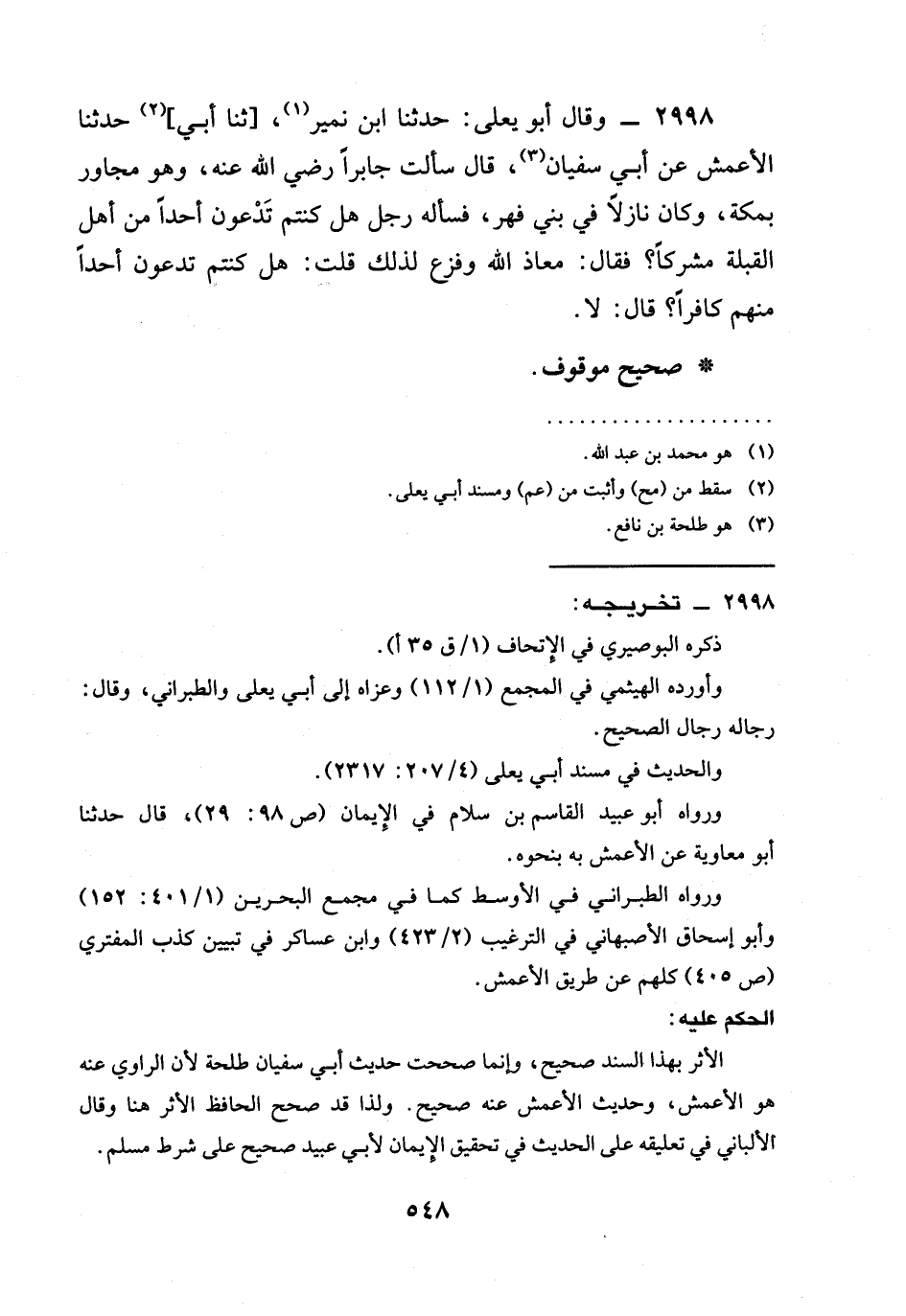 2998 - وَقَالَ أَبُو يَعْلَى: حَدَّثَنَا ابْنُ نُمَيْرٍ، [ثنا أَبِي] حَدَّثَنَا الْأَعْمَشُ عَنْ أَبِي سُفْيَانَ، قَالَ سَأَلْتُ جَابِرًا رَضِيَ الله عَنْهُ، وَهُوَ مُجَاوِرٌ بِمَكَّةَ، وَكَانَ نَازِلًا فِي بَنِي فِهْرٍ، فَسَأَلَهُ رَجُلٌ §هَلْ كُنْتُمْ تَدْعُونَ أَحَدًا مِنْ أَهْلِ الْقِبْلَةِ مُشْرِكًا؟ فَقَالَ: مَعَاذَ اللَّهِ وَفَزِعَ لِذَلِكَ قُلْتُ: هَلْ كُنْتُمْ تَدْعُونَ أَحَدًا مِنْهُمْ كَافِرًا؟ قَالَ: لَا.
