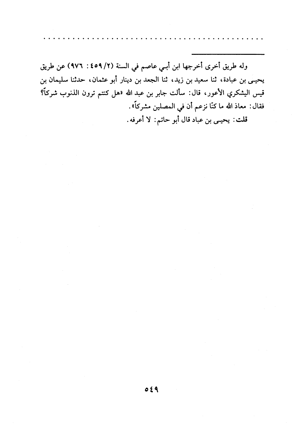 = وله طريق أخرى أخرجها ابن أبي عاصم في السنة (2/ 459: 976) عن طريق يحيي بن عبادة، ثنا سعيد بن زيد، ثنا الجعد بن دينار أبو عثمان، حدّثنا سليمان بن قيس اليشكري الأعور، قال: سألت جابر بن عبد الله "هل كنتم ترون الذنوب شركًا؟ فقال: معاذ الله ما كنّا نزعم أن في المصلين مشركًا".