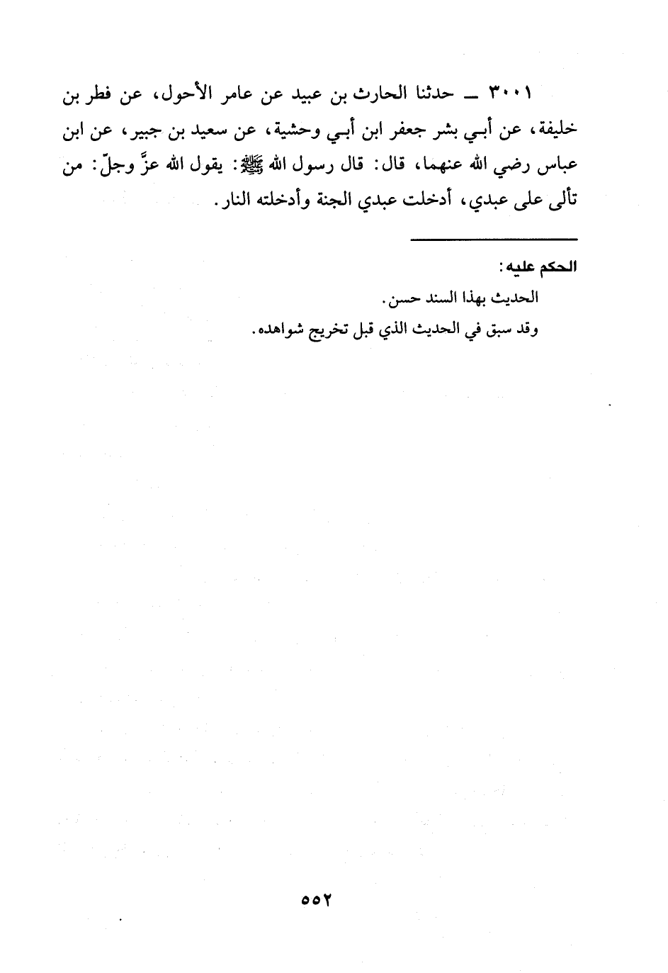 3001 - حَدَّثَنَا الْحَارِثُ بْنُ عُبَيْدٍ عَنْ عَامِرٍ الْأَحْوَلِ، عَنْ فِطْرِ بْنِ خَلِيفَةَ، عَنْ أَبِي بِشْرٍ جَعْفَرِ ابن أَبِي وَحْشِيَّةَ، عَنْ سَعِيدِ بْنِ جُبَيْرٍ، عَنِ ابْنِ عَبَّاسٍ رَضِيَ الله عَنْهُمَا، قَالَ: قَالَ رَسُولُ اللَّهِ صَلَّى اللَّهُ عَلَيْهِ وَسَلَّمَ: يَقُولُ اللَّهُ عَزَّ وَجَلَّ: §مَنْ تَأَلَّى عَلَى عَبْدِي، أَدْخَلْتُ عَبْدِيَ الْجَنَّةَ وَأَدْخَلْتُهُ النَّارَ.