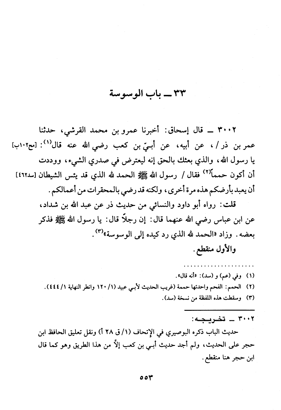 3002 - قَالَ إِسْحَاقُ: أَخْبَرَنَا عَمْرُو بْنُ مُحَمَّدٍ الْقُرَشِيُّ، حَدَّثَنَا عُمَرُ بْنُ ذَرٍّ / عَنْ أَبِيهِ، عَنْ أُبَيِّ بْنِ كَعْبٍ رَضِيَ الله عَنْهُ قَالَ: يَا رَسُولَ اللَّهِ، وَالَّذِي بَعَثَكَ بِالْحَقِّ إِنَّهُ ليعترض فِي صَدْرِي الشَّيْءُ، وَوَدِدْتُ أَنْ أَكُونَ حُمَمًا فَقَالَ / رَسُولُ اللَّهِ صَلَّى اللَّهُ عَلَيْهِ وَسَلَّمَ §الْحَمْدُ لِلَّهِ الذي قد يئس الشَّيْطَانَ أَنْ يُعْبَدُ بِأَرْضِكُمْ هَذِهِ مَرَّةً أُخْرَى، وَلَكِنَّهُ قَدْ رَضِيَ بِالْمُحَقَّرَاتِ مِنْ أَعْمَالِكُمْ.