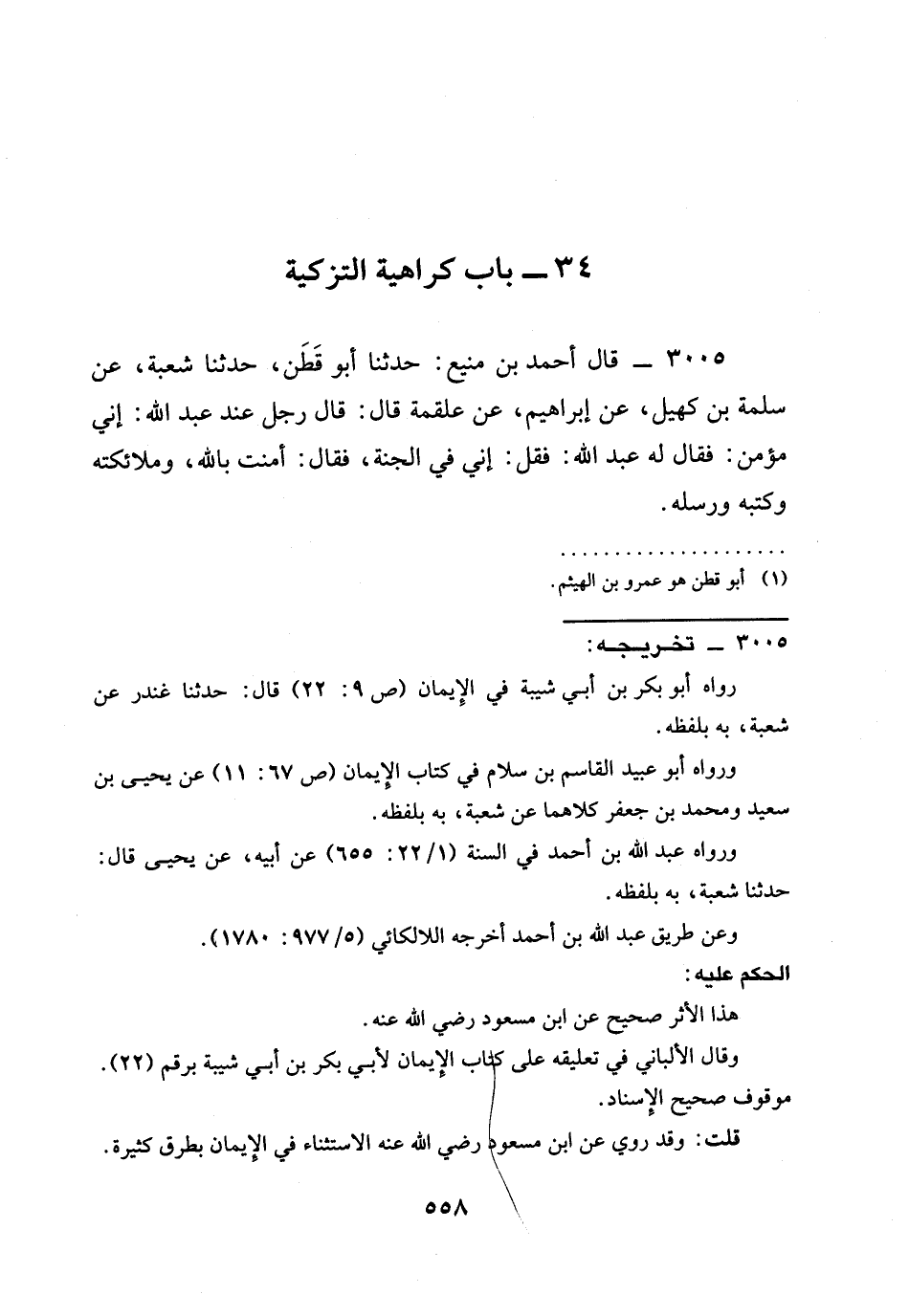 3005 - قَالَ أَحْمَدُ بْنُ مَنِيعٍ: حَدَّثَنَا أَبُو قَطَنٍ، حَدَّثَنَا شُعْبَةُ، عَنْ سَلَمَةَ بْنِ كُهَيْلٍ، عَنْ إِبْرَاهِيمَ، عَنْ عَلْقَمَةَ قَالَ: قَالَ رَجُلٌ عِنْدَ عَبْدِ اللَّهِ: إِنِّي مُؤْمِنٌ: فَقَالَ لَهُ عَبْدُ اللَّهِ: فَقُلْ: إِنِّي فِي الْجَنَّةِ، فَقَالَ: §آمَنْتُ بِاللَّهِ، وَمَلَائِكَتِهِ وَكُتُبِهِ وَرُسُلِهِ.