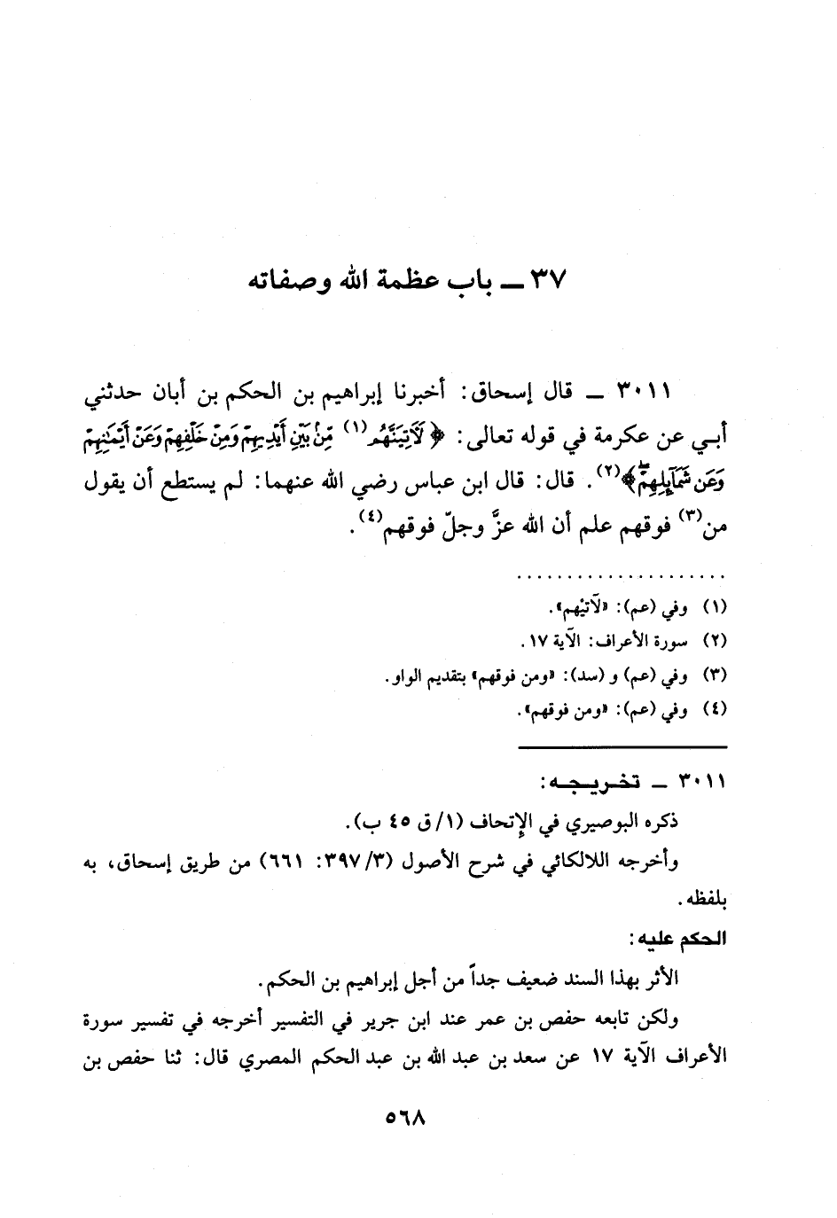 3011 - قَالَ إِسْحَاقُ: أَخْبَرَنَا إِبْرَاهِيمُ بْنُ الْحَكَمِ بْنِ أَبَانَ حَدَّثَنِي أَبِي عَنْ عِكْرِمَةَ فِي قَوْلِهِ تَعَالَى: {لَآتِيَنَّهُمْ مِنْ بَيْنِ أَيْدِيهِمْ وَمِنْ خَلْفِهِمْ وَعَنْ أَيْمَانِهِمْ وَعَنْ شَمَائِلِهِمْ} . قَالَ: قَالَ ابْنُ عَبَّاسٍ رَضِيَ الله عَنْهُمَا: §لَمْ يَسْتَطِعْ أَنْ يَقُولَ مِنْ فَوْقِهِمْ عَلِمَ أَنَّ اللَّهَ عَزَّ وَجَلَّ فَوْقَهُمْ.