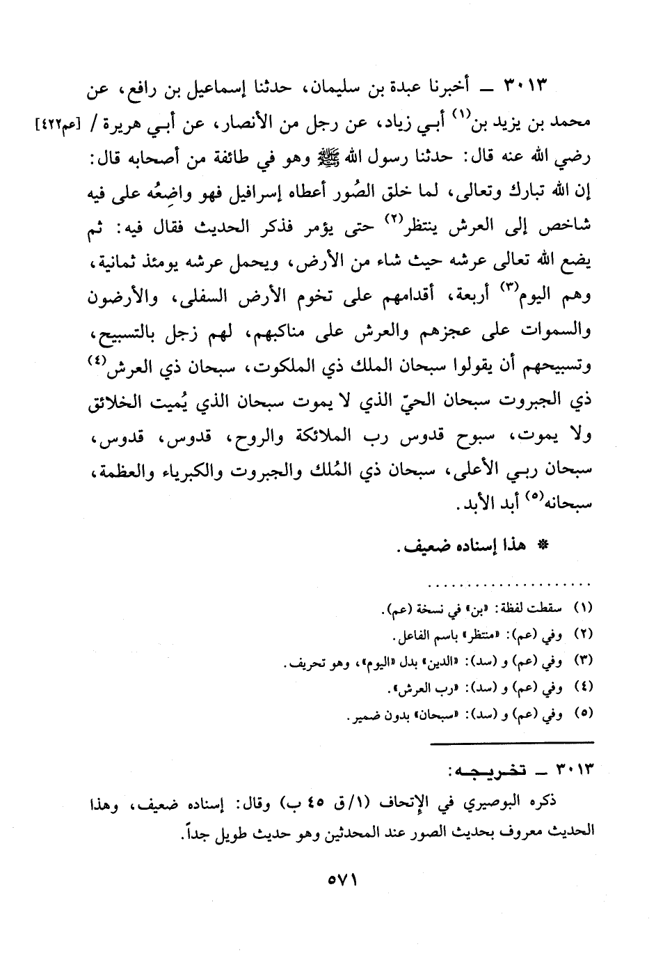 3013 - أَخْبَرَنَا عَبْدَةُ بْنُ سُلَيْمَانَ، حَدَّثَنَا إِسْمَاعِيلُ بْنُ رَافِعٍ، عَنْ مُحَمَّدِ بْنِ يَزِيدَ بْنِ أَبِي زِيَادٍ، عَنْ رَجُلٍ مِنَ الْأَنْصَارِ، عَنْ أَبِي هُرَيْرَةَ / رَضِيَ الله عَنْهُ قَالَ: حَدَّثَنَا رَسُولُ اللَّهِ صَلَّى اللَّهُ عَلَيْهِ وَسَلَّمَ وَهُوَ فِي طَائِفَةٍ مِنْ أَصْحَابِهِ قَالَ: إِنَّ اللَّهَ تَبَارَكَ وَتَعَالَى، §لَمَّا خَلَقَ الصُّورَ أَعْطَاهُ إِسْرَافِيلَ فَهُوَ وَاضِعُهُ عَلَى فِيهِ شَاخِصٌ إِلَى الْعَرْشِ يَنْتَظِرُ حَتَّى يُؤْمَرَ فذكر الحديث فقال فِيهِ: ثُمَّ يَضَعُ اللَّهُ تَعَالَى عَرْشَهُ حَيْثُ شَاءَ مِنَ الْأَرْضِ، وَيَحْمِلُ عَرْشَهُ يَوْمَئِذٍ ثَمَانِيَةٌ، وَهُمُ الْيَوْمَ أَرْبَعَةٌ، أَقْدَامُهُمْ عَلَى تُخُومِ الْأَرْضِ السُّفْلَى، وَالْأَرَضُونَ والسموات عَلَى عَجُزِهِمْ وَالْعَرْشُ عَلَى مَنَاكِبِهِمْ، لَهُمْ زَجَلٌ بِالتَّسْبِيحِ، وَتَسْبِيحُهُمْ أَنْ يَقُولُوا سُبْحَانَ الْمَلِكِ ذِي الْمَلَكُوتِ، سُبْحَانَ ذِي الْعَرْشِ ذِي الْجَبَرُوتِ سُبْحَانَ الْحَيِّ الَّذِي لَا يَمُوتُ سُبْحَانَ الَّذِي يُمِيتُ الْخَلَائِقَ وَلَا يَمُوتُ، سُبُّوحٌ قُدُّوسٌ رَبُّ الْمَلَائِكَةِ وَالرُّوحِ، قُدُّوسٌ، قُدُّوسٌ، سُبْحَانَ رَبِّيَ الْأَعْلَى، سُبْحَانَ ذِي الْمُلْكِ وَالْجَبَرُوتِ وَالْكِبْرِيَاءِ وَالْعَظَمَةِ، سُبْحَانَهُ أَبَدَ الْأَبَدِ.