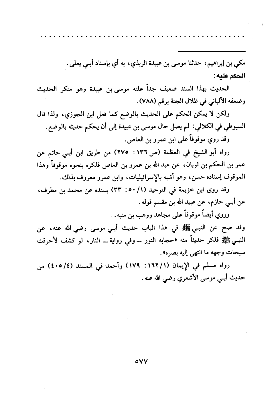 وقد صح عَنِ النَّبِيِّ -صَلَّى اللَّهُ عَلَيْهِ وَسَلَّمَ- فِي هذا الباب حديث أبي موسى رضي الله عنه، عن النبي -صلى الله عليه وسلم- فذكر حديثًا منه "حجابه النور -وفي رواية- النار، لو كشف لأحرقت سبحات وجهه ما انتهى إليه بصره".