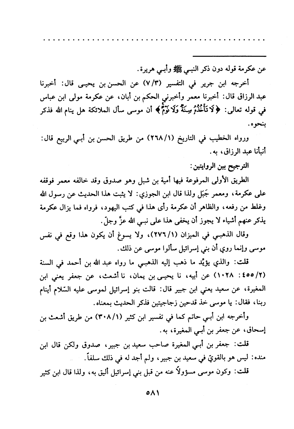 قلت: والذي يؤيِّد ما ذهب إليه الذهبي ما رواه عبد الله بن أحمد في السنة (2/ 455: 1028) عن أبيه، نا يحيي بن يمان، نا أشعث، عن جعفر يعني ابن المغيرة، عن سعيد يعني ابن جبير قال: قالت ينو إسرائيل لموسى عليه السّلام أينام ربنا، فقال: يا موسى خذ قدحين زجاجيتين فذكر الحديث بمعناه.