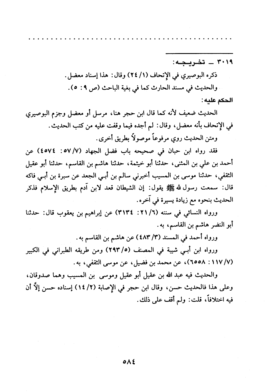 فقد رواه ابن حبّان في صحيحه باب فضل الجهاد (7/ 57: 4574) عن أحمد بن علي بن المثنى، حدّثنا أبو خيثمة، حَدَّثَنَا هَاشِمُ بْنُ الْقَاسِمِ، حَدَّثَنَا أَبُو عَقِيلٍ الثقفي، حدّثنا موسى بن المسيّب أخبرني سالم بن أبي الجعد عن سبرة بن أبي فاكه قال: سمعت رسول لله -صلى الله عليه وسلم- يقول: إن الشيطان قعد لابن آدم بطريق الإِسلام فذكر الحديث بنحوه مع زيادة يسيرة في آخره.