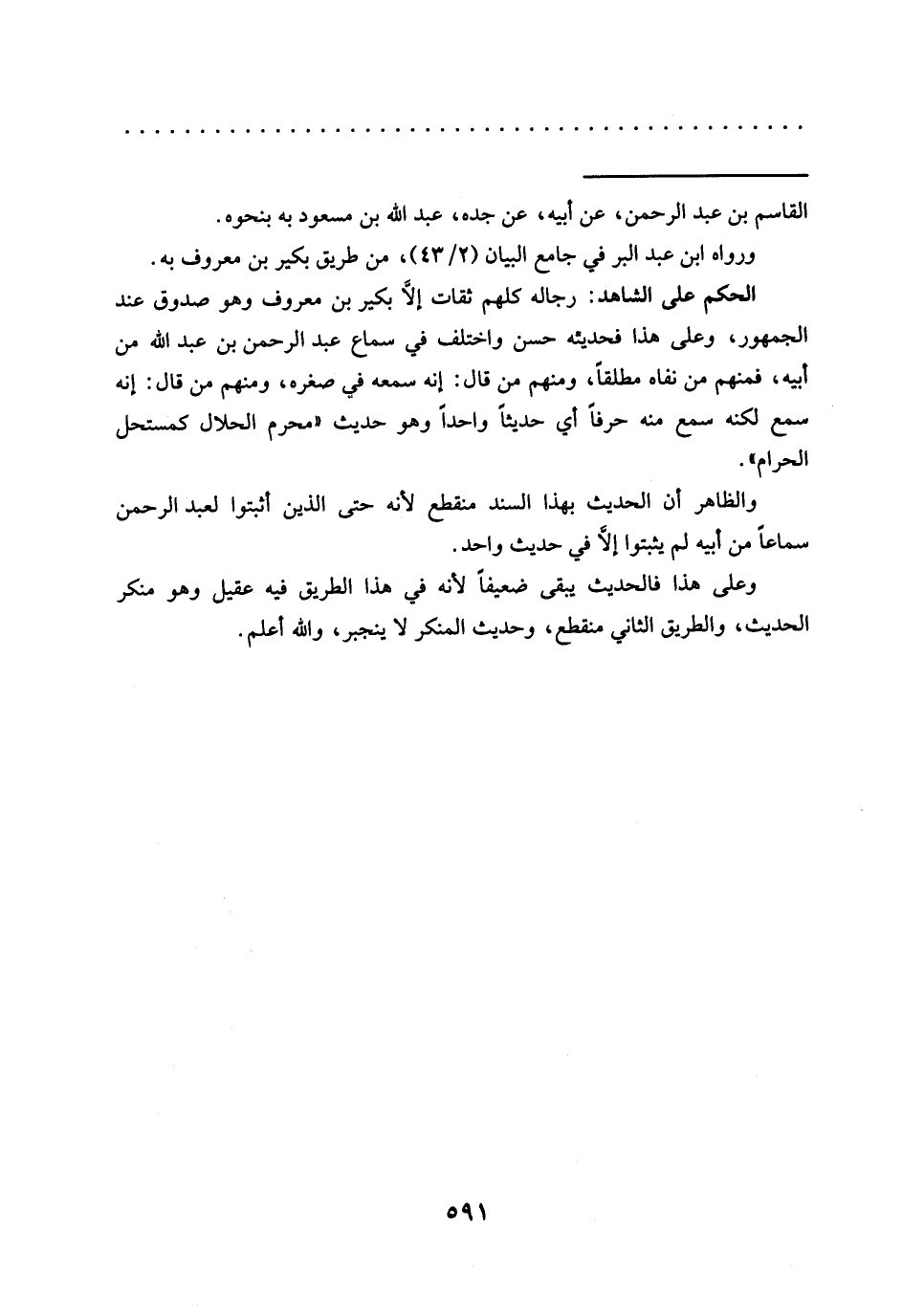 والظاهر أن الحديث بهذا السند منقطع لأنه حتى الذين أثبتوا لعبد الرحمن سماعًا من أبيه لم يثبتوا إلّا في حديث واحد.