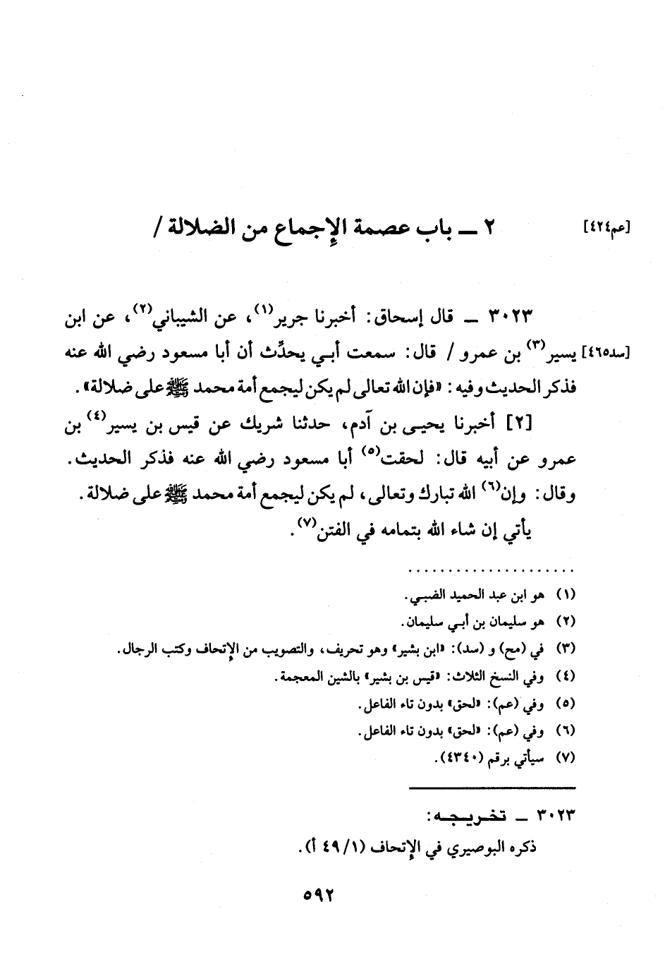 3023 - قَالَ إِسْحَاقُ: أَخْبَرَنَا جَرِيرٌ، عَنِ الشَّيْبَانِيِّ، عَنِ ابْنِ يَسِيرَ بْنِ عَمْرٍو / قَالَ: سَمِعْتُ أَبِي يُحَدِّثُ أَنَّ أَبَا مَسْعُودٍ رَضِيَ الله عَنْهُ فَذَكَرَ الْحَدِيثَ وَفِيهِ: " فَإِنَّ اللَّهَ تَعَالَى §لَمْ يَكُنْ لَيَجْمَعَ أُمَّةَ مُحَمَّدٍ صَلَّى اللَّهُ عَلَيْهِ وَسَلَّمَ عَلَى ضَلَالَةٍ ".