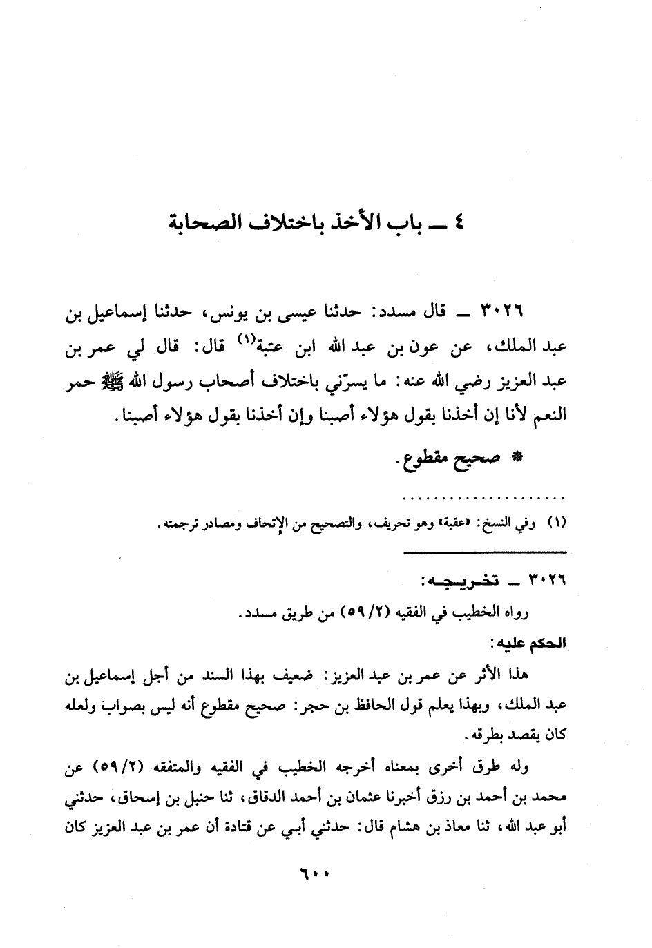 3026 - قَالَ مُسَدَّدٌ: حَدَّثَنَا عِيسَى بْنُ يُونُسَ، حَدَّثَنَا إِسْمَاعِيلُ بْنُ عَبْدِ الْمَلِكِ، عَنْ عَوْنِ بْنِ عَبْدِ اللَّهِ ابن عُتْبَةَ قَالَ: قَالَ لِي عُمَرُ بْنُ عَبْدِ الْعَزِيزِ رَضِيَ الله عَنْهُ: §مَا يَسُرُّنِي بِاخْتِلَافِ أَصْحَابِ رَسُولِ اللَّهِ صَلَّى اللَّهُ عَلَيْهِ وَسَلَّمَ حُمْرُ النَّعَمِ لِأَنَّا إِنْ أَخَذْنَا بِقَوْلِ هَؤُلَاءِ أَصَبْنَا وَإِنْ أَخَذْنَا بِقَوْلِ هَؤُلَاءِ أَصَبْنَا.