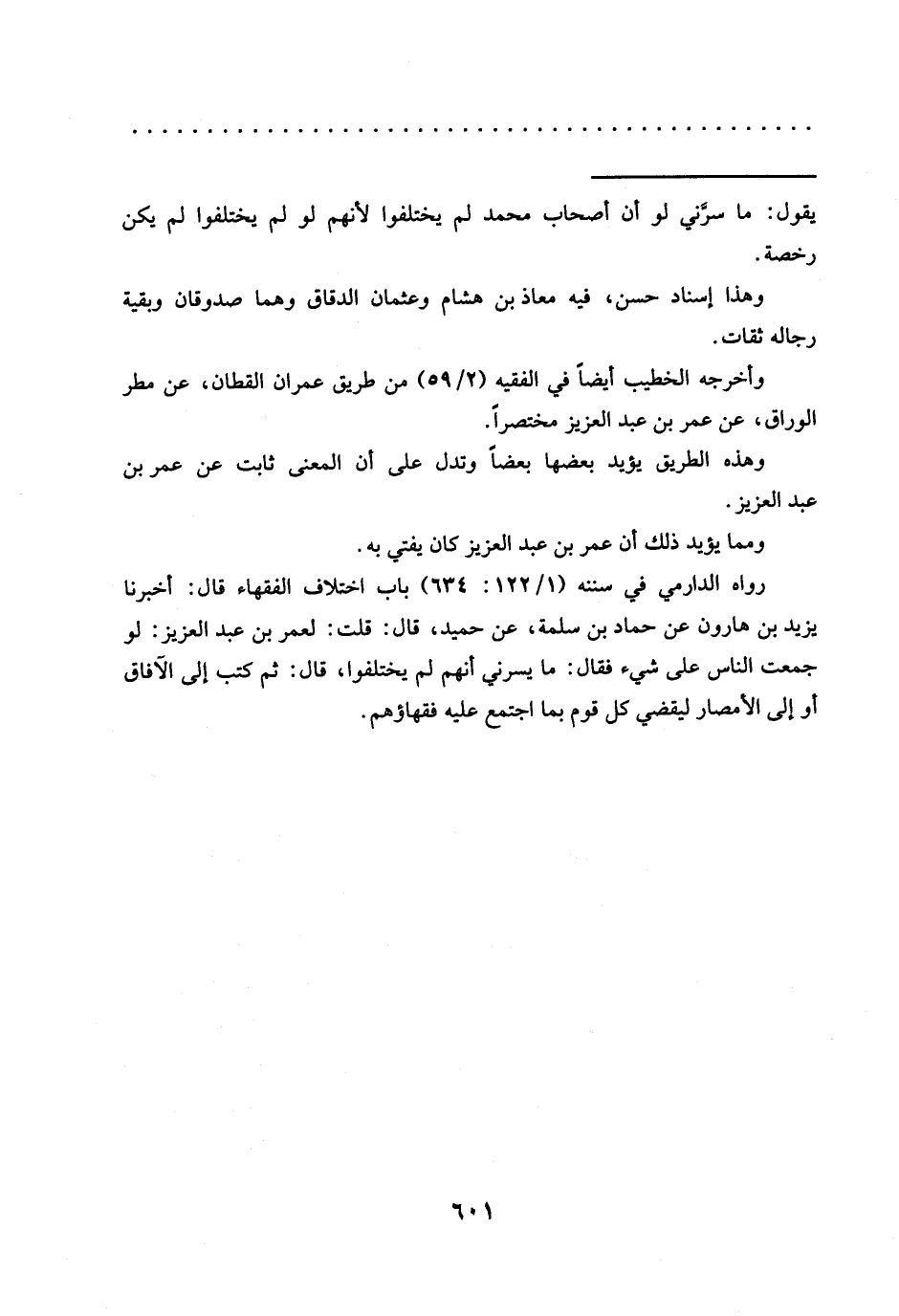 رواه الدارمي في سننه (1/ 122: 634) باب اختلاف الفقهاء قال: أخبرنا يزيد بن هارون عن حماد بن سلمة، عن حميد، قال: قلت: لعمر بن عبد العزيز: لو جمعت الناس على شيء فقال: ما يسرني أنهم لم يختلفوا، قال: ثم كتب إلى الآفاق أو إلى الأمصار ليقضي كل قوم بما اجتمع عليه فقهاؤهم.
