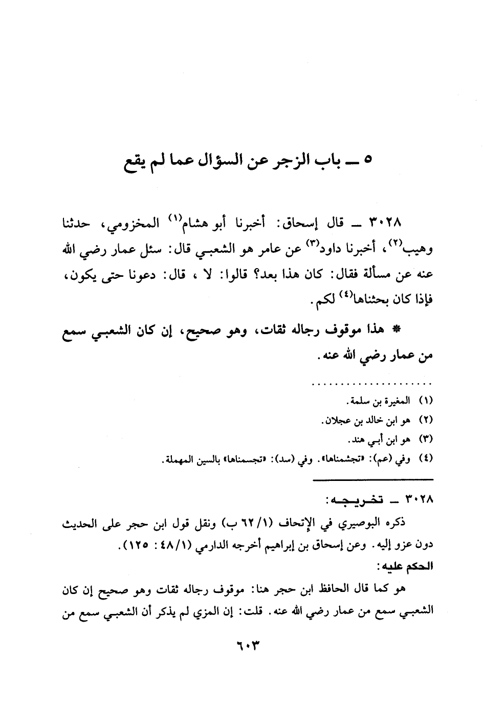 3028 - قَالَ إِسْحَاقُ: أَخْبَرَنَا أَبُو هِشَامٍ الْمَخْزُومِيُّ، حَدَّثَنَا وُهَيْبٌ، أَخْبَرَنَا دَاوُدُ عَنْ عَامِرٍ هُوَ الشَّعْبِيُّ قَالَ: سُئِلَ عَمَّارٌ رَضِيَ الله عَنْهُ عَنْ مَسْأَلَةٍ فَقَالَ: كَانَ هَذَا بَعْدُ؟ قَالُوا: لَا، قَالَ: §دَعُونَا حَتَّى يَكُونَ، فَإِذَا كَانَ بَحَثْنَاهَا لَكُمْ.