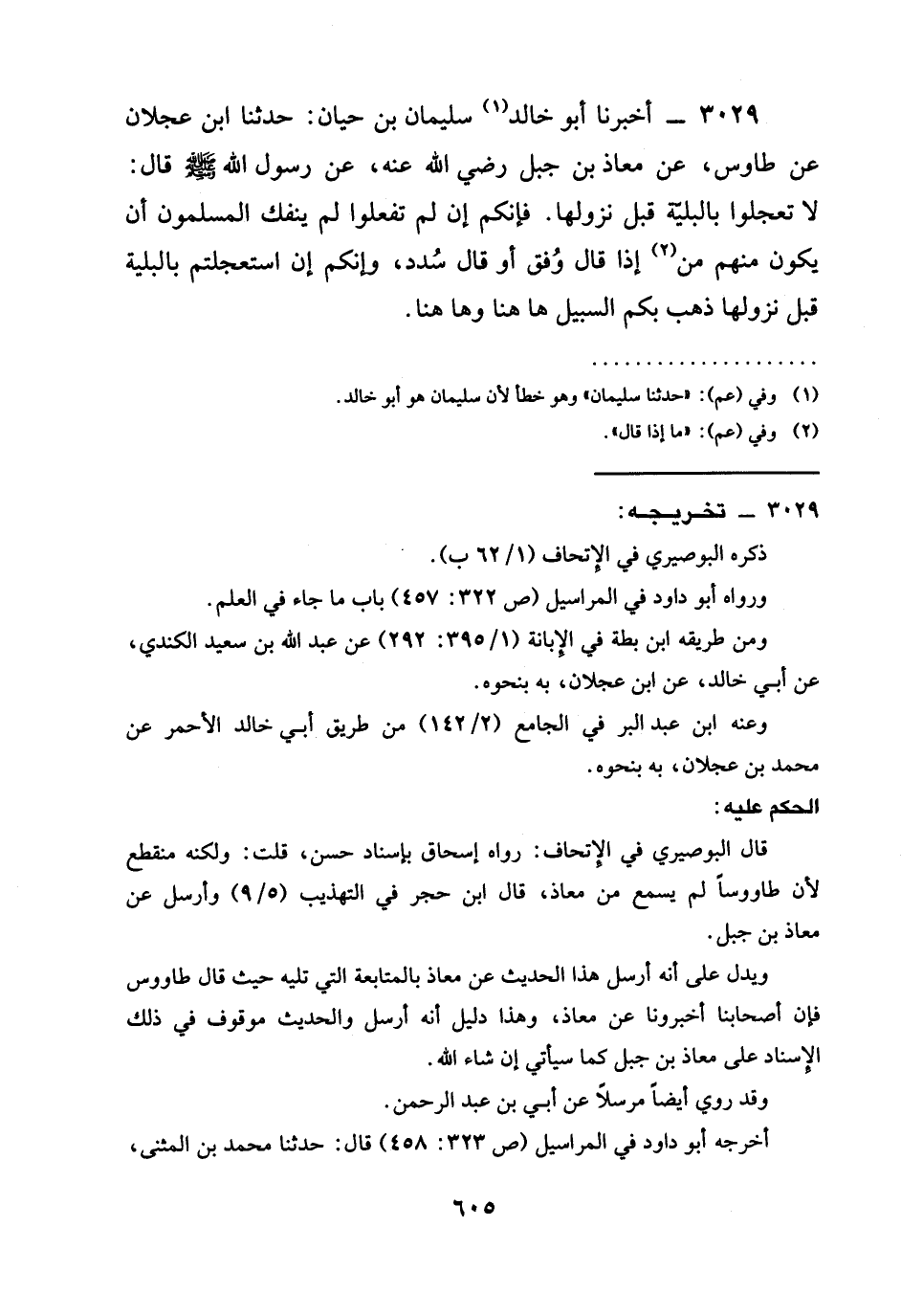 3029 - أَخْبَرَنَا أَبُو خالد بن سُلَيْمَانُ بْنُ حَيَّانَ: حَدَّثَنَا ابْنُ عَجْلَانَ عَنْ طَاوُسٍ، عَنْ مُعَاذِ بْنِ جَبَلٍ رَضِيَ الله عَنْهُ، عَنْ رَسُولِ اللَّهِ صَلَّى اللَّهُ عَلَيْهِ وَسَلَّمَ قَالَ: §لَا تَعْجَلُوا بِالْبَلِيَّةِ قَبْلَ نُزُولِهَا. فَإِنَّكُمْ إِنْ لَمْ تَفْعَلُوا لَمْ يَنْفَكُّ الْمُسْلِمُونَ أَنْ يَكُونَ مِنْهُمْ مَنْ إِذَا قَالَ وُفِّقَ أَوْ قَالَ سُدِّدَ، وَإِنَّكُمْ إِنِ اسْتَعْجَلْتُمْ بِالْبَلِيَّةِ قَبْلَ نُزُولِهَا ذَهَبَ بكم السبيل ها هنا وها هنا.