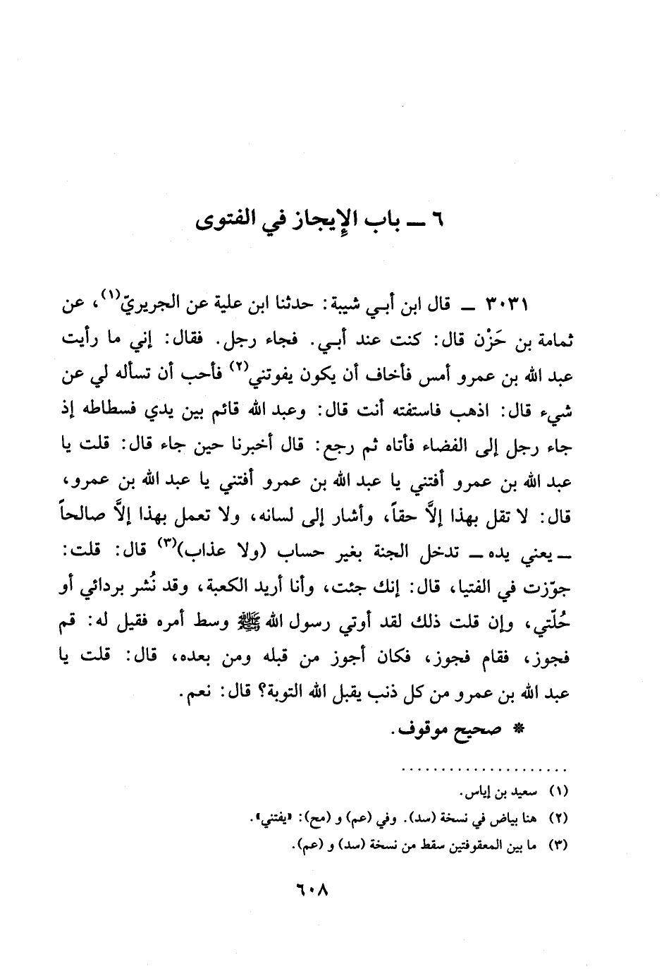 3031 - قَالَ ابْنُ أَبِي شَيْبَةَ: حَدَّثَنَا ابْنُ عُلَيَّةَ عَنِ الْجُرَيْرِيِّ، عَنْ ثُمَامَةَ بْنِ حَزْنٍ قَالَ: كُنْتُ عِنْدَ أُبَيٍّ. فَجَاءَ رَجُلٌ. فَقَالَ: إِنِّي مَا رَأَيْتُ عَبْدَ اللَّهِ بْنَ عَمْرٍو أَمْسِ فَأَخَافُ أَنْ يَكُونَ يَفُوتُنِي فَأُحِبُّ أَنْ تَسْأَلَهُ لِي عَنْ شَيْءٍ قَالَ: اذْهَبْ فَاسْتَفْتِهِ أَنْتَ قَالَ: وَعَبْدُ اللَّهِ قَائِمٌ بَيْنَ يَدَيْ فُسْطَاطِهِ إِذْ جَاءَ رَجُلٌ إِلَى الْفَضَاءِ فَأَتَاهُ ثُمَّ رَجَعَ: قَالَ أَخْبَرَنَا حِينَ جَاءَ قَالَ: قُلْتُ يَا عَبْدَ اللَّهِ بْنَ عَمْرٍو أَفْتِنِي يَا عَبْدَ اللَّهِ بْنَ عَمْرٍو أَفْتِنِي يَا عَبْدَ اللَّهِ بْنَ عَمْرٍو، قَالَ: §لَا تَقُلْ بِهَذَا إِلَّا حَقًّا، وَأَشَارَ إِلَى لِسَانِهِ، وَلَا تَعْمَلْ بِهَذَا إِلَّا صَالِحًا - يَعْنِي يَدَهُ - تَدْخُلِ الْجَنَّةَ بِغَيْرِ حِسَابٍ (وَلَا عَذَابٍ) قَالَ: قُلْتُ: جَوَّزْتَ فِي الْفُتْيَا، قَالَ: إِنَّكَ جِئْتَ، وَأَنَا أُرِيدُ الْكَعْبَةَ، وَقَدْ نُشِرَ بِرِدَائِي أَوْ حُلَّتِي، وَإِنْ قُلْتُ ذَلِكَ لَقَدْ أُوتِيَ رَسُولُ اللَّهِ صَلَّى اللَّهُ عَلَيْهِ وَسَلَّمَ وَسْطُ أَمْرِهِ فَقِيلَ لَهُ: قُمْ فَجَوِّزْ، فَقَامَ فَجَوَّزَ، فَكَانَ أَجْوَزَ مَنْ قَبْلَهُ وَمَنْ بَعْدَهُ، قَالَ: قُلْتُ يَا عَبْدَ اللَّهِ بْنَ عَمْرٍو مِنْ كُلِّ ذَنْبٍ يَقْبَلُ اللَّهُ التَّوْبَةَ؟ قَالَ: نَعَمْ.