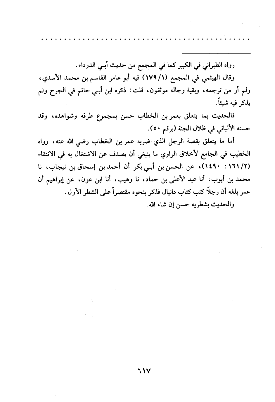 وقال الهيثمي في المجمع (1/ 179) فيه أبو عامر القاسم بن محمَّد الأسدي، ولم أر من ترجمه، وبقية رجاله موثقون، قلت: ذكره ابن أبي حاتم في الجرح ولم يذكر فيه شيئًا.