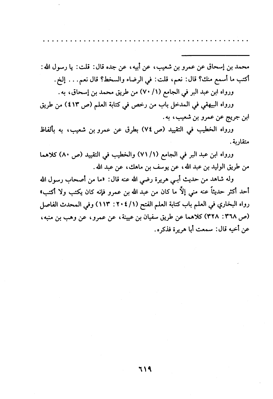 = محمَّد بْنُ إِسْحَاقَ عَنْ عَمْرِو بْنِ شُعَيْبٍ، عَنْ أَبِيهِ، عَنْ جده قال: قلت: يا رسول الله: أكتب ما أسمع منك؟ قال: نعم، قلت: في الرضاء والسخط؟ قال نعم ... إلخ.