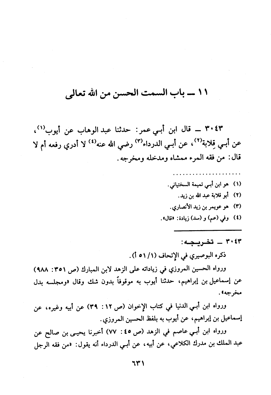3043 - قَالَ ابْنُ أَبِي عُمَرَ: حَدَّثَنَا عَبْدُ الْوَهَّابِ عَنْ أَيُّوبَ، عَنْ أَبِي قِلَابَةَ، عَنْ أَبِي الدَّرْدَاءِ رَضِيَ الله عَنْهُ لَا أدري رفعه أم لَا قَالَ: §مِنْ فِقْهِ الْمَرْءِ مَمْشَاهُ وَمَدْخَلُهُ وَمَخْرَجُهُ.