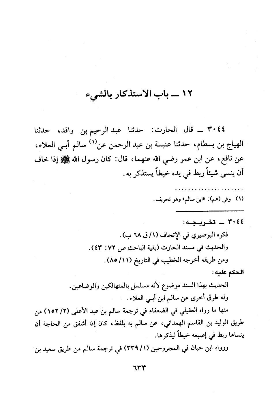 3044 - قَالَ الْحَارِثُ: حَدَّثَنَا عَبْدُ الرَّحِيمِ بْنُ وَاقِدٍ، حَدَّثَنَا الْهَيَّاجُ بْنُ بِسْطَامٍ، حَدَّثَنَا عَنْبَسَةُ بْنُ عَبْدِ الرَّحْمَنِ عَنْ سَالِمِ أَبِي الْعَلَاءِ، عَنْ نَافِعٍ عَنِ ابْنِ عُمَرَ رَضِيَ الله عَنْهُمَا، قَالَ: كَانَ رَسُولُ اللَّهِ صَلَّى اللَّهُ عَلَيْهِ وَسَلَّمَ §إِذَا خَافَ أَنْ يَنْسَى شَيْئًا رَبَطَ فِي يَدِهِ خَيْطًا يَسْتَذْكِرُ بِهِ.