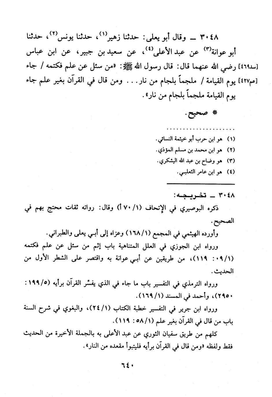 3048 - وَقَالَ أَبُو يَعْلَى: حَدَّثَنَا زُهَيْرٌ، حَدَّثَنَا يُونُسُ، حَدَّثَنَا أَبُو عَوَانَةَ عَنْ عَبْدِ الْأَعْلَى، عَنْ سَعِيدِ بْنِ جُبَيْرٍ، عَنِ ابْنِ عَبَّاسٍ رَضِيَ الله عَنْهُمَا قَالَ: قَالَ رَسُولُ اللَّهِ صَلَّى اللَّهُ عَلَيْهِ وَسَلَّمَ: " §مَنْ سُئِلَ عَنْ عِلْمٍ فَكَتَمَهُ / جَاءَ يَوْمَ الْقِيَامَةِ / مُلْجَمًا بِلِجَامٍ مِنْ نَارٍ ... وَمَنْ قَالَ فِي الْقُرْآنِ بِغَيْرِ عِلْمٍ جَاءَ يَوْمَ الْقِيَامَةِ مُلْجَمًا بِلِجَامٍ مِنْ نَارٍ ".
