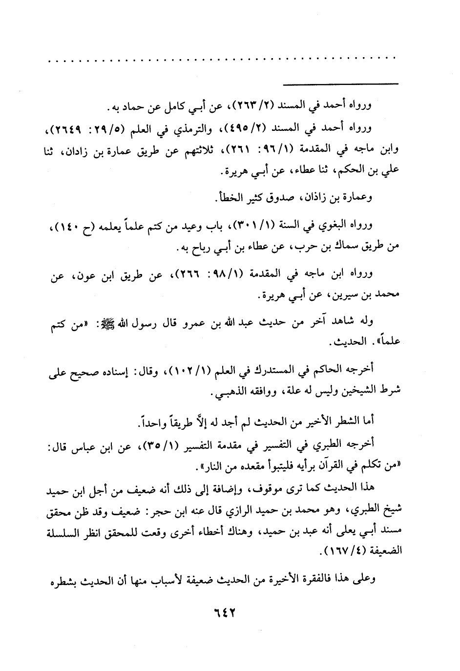 ورواه أحمد في المسند (2/ 495)، والترمذي في العلم (5/ 29: 2649)، وابن ماجه في المقدمة (1/ 96: 261)، ثلاثتهم عن طريق عمارة بن زادان، ثنا علي بن الحكم، ثنا عطاء، عن أبي هريرة.