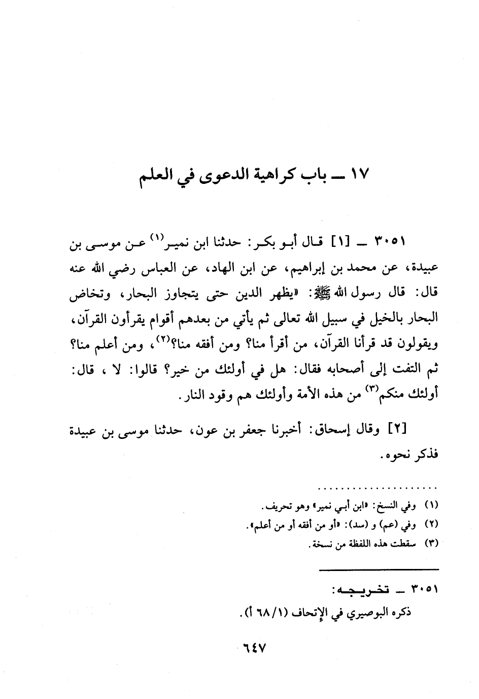 3051 -[1] قَالَ أَبُو بَكْرٍ: حَدَّثَنَا ابْنُ نُمَيْرٍ عَنْ مُوسَى بْنِ عُبَيْدَةَ، عَنْ مُحَمَّدِ بْنِ إِبْرَاهِيمَ، عَنِ ابْنِ الْهَادِ، عَنِ الْعَبَّاسِ رَضِيَ الله عَنْهُ قَالَ: قَالَ رَسُولُ اللَّهِ صَلَّى اللَّهُ عَلَيْهِ وَسَلَّمَ: " §يَظْهَرُ الدِّينُ حَتَّى يَتَجَاوَزَ الْبِحَارَ، وَتُخَاضُ الْبِحَارُ بِالْخَيْلِ فِي سَبِيلِ اللَّهِ تَعَالَى ثُمَّ يَأْتِي مِنْ بَعْدِهِمْ أَقْوَامٌ يقرأون الْقُرْآنَ، وَيَقُولُونَ قَدْ قَرَأْنَا الْقُرْآنَ، مَنْ أَقْرَأُ مِنَّا؟ وَمَنْ أَفْقَهُ مِنَّا؟ ، وَمَنْ أَعْلَمُ مِنَّا؟ ثُمَّ الْتَفَتَ إِلَى أَصْحَابِهِ فَقَالَ: هَلْ فِي أُولَئِكَ مِنْ خَيْرٍ؟ قَالُوا: لَا، قَالَ: أُولَئِكَ مِنْكُمْ مِنْ هَذِهِ الْأُمَّةِ وَأُولَئِكَ هُمْ وَقُودُ النَّارِ.