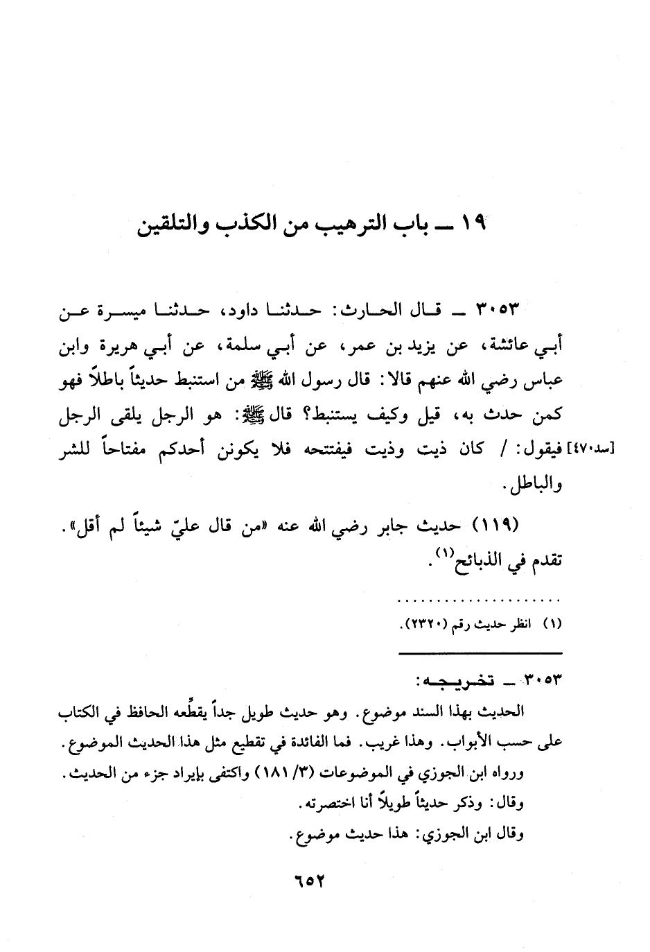 3053 - قَالَ الْحَارِثُ: حَدَّثَنَا دَاوُدُ، حَدَّثَنَا مَيْسَرَةُ عَنْ أَبِي عَائِشَةَ، عَنْ يَزِيدَ بْنِ عُمَرَ، عَنْ أَبِي سَلَمَةَ، عَنْ أَبِي هُرَيْرَةَ وَابْنِ عَبَّاسٍ رَضِيَ الله عَنْهُمْ قَالَا: قَالَ رَسُولُ اللَّهِ صَلَّى اللَّهُ عَلَيْهِ وَسَلَّمَ §مَنِ اسْتَنْبَطَ حَدِيثًا بَاطِلًا فَهُوَ كَمَنْ حَدَّثَ بِهِ، قِيلَ وَكَيْفَ يَسْتَنْبِطُ؟ قَالَ صَلَّى اللَّهُ عَلَيْهِ وَسَلَّمَ: هُوَ الرَّجُلُ يَلْقَى الرَّجُلَ فَيَقُولُ: / كَانَ ذَيْتَ وَذَيْتَ فَيَفْتَتِحُهُ فَلَا يَكُونَنَّ أَحَدُكُمْ مِفْتَاحًا لِلشَّرِّ وَالْبَاطِلِ.