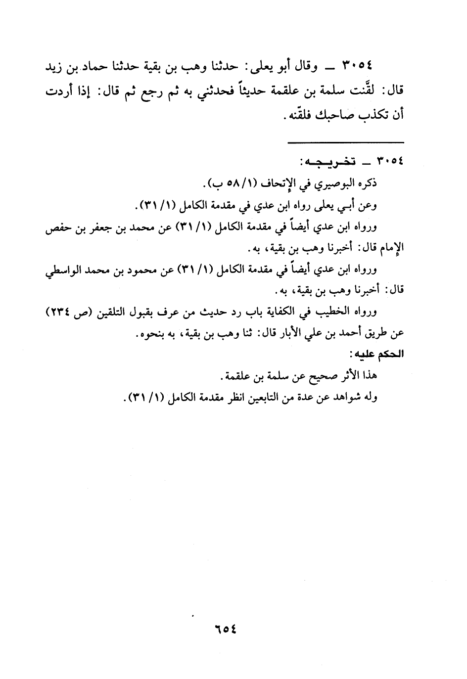3054 - وَقَالَ أَبُو يَعْلَى: حَدَّثَنَا وَهْبُ بْنُ بَقِيَّةَ حَدَّثَنَا حَمَّادُ بْنُ زَيْدٍ قَالَ: لَقَّنْتُ سَلَمَةَ بْنَ عَلْقَمَةَ حَدِيثًا فَحَدَّثَنِي بِهِ ثُمَّ رَجَعَ ثُمَّ قَالَ: §إِذَا أَرَدْتَ أَنْ تَكْذِبَ صَاحِبُكَ فَلَقِّنْهُ.