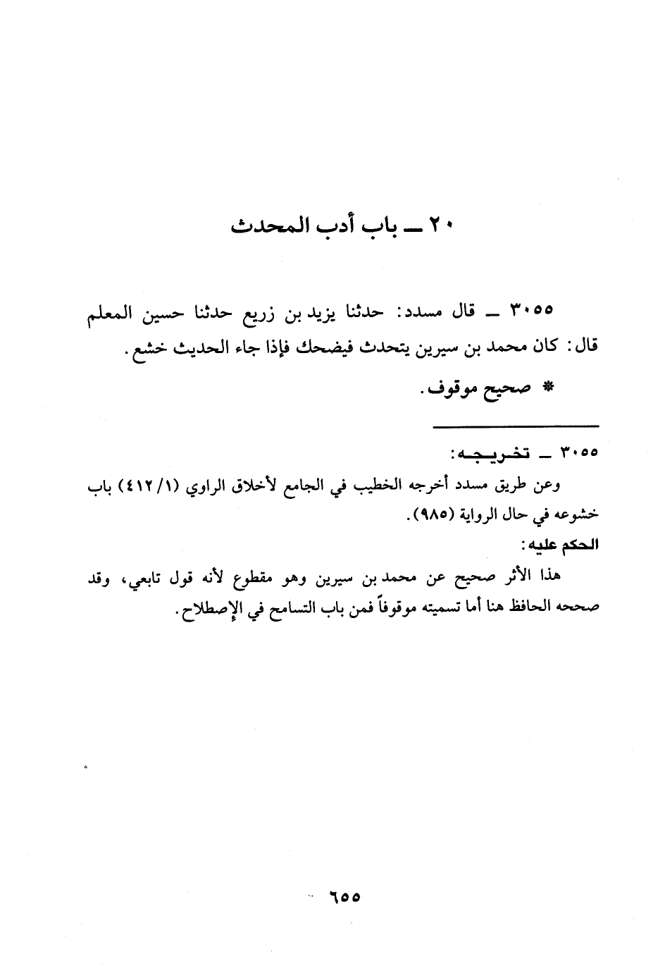 3055 - قَالَ مُسَدَّدٌ: حَدَّثَنَا يَزِيدُ بْنُ زُرَيْعٍ حَدَّثَنَا حُسَيْنٌ الْمُعَلِّمِ قَالَ: §كَانَ مُحَمَّدُ بْنُ سِيرِينَ يَتَحَدَّثُ فَيَضْحَكُ فَإِذَا جَاءَ الْحَدِيثُ خَشَعَ.