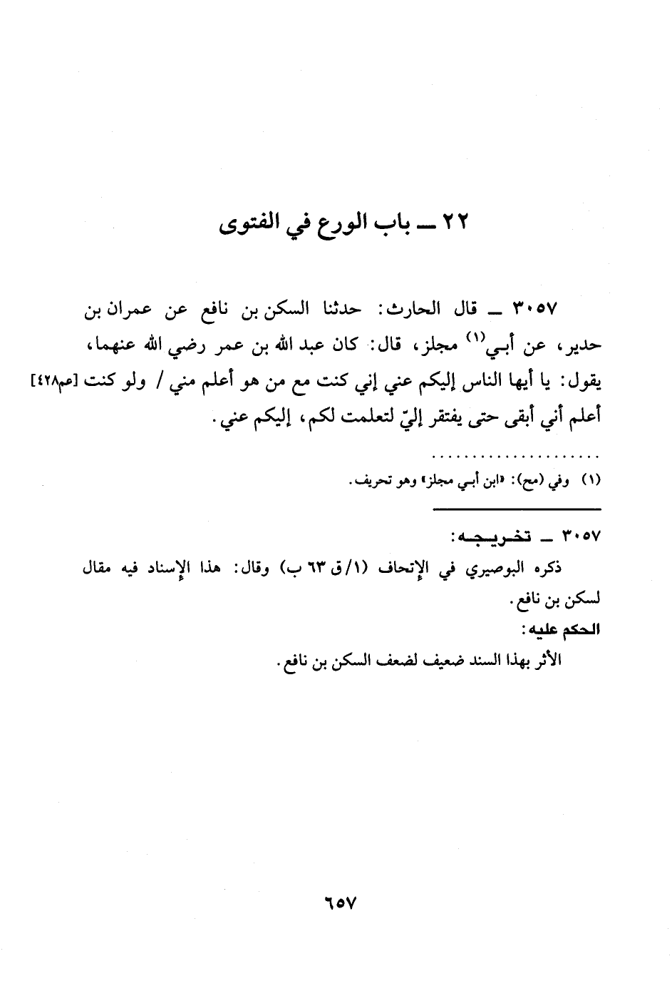 3057 - قَالَ الْحَارِثُ: حَدَّثَنَا السَّكَنُ بْنُ نَافِعٍ عَنْ عِمْرَانَ بْنِ حُدَيْرٍ، عَنْ أَبِي مِجْلَزٍ، قَالَ: كَانَ عَبْدُ اللَّهِ بْنُ عُمَرَ رَضِيَ الله عَنْهُمَا، يَقُولُ: يَا أَيُّهَا النَّاسُ إِلَيْكُمْ عَنِّي إِنِّي كُنْتُ مَعَ مَنْ هُوَ أَعْلَمُ مِنِّي / §وَلَوْ كُنْتُ أَعْلَمُ أَنِّي أَبْقَى حَتَّى يُفْتَقَرَ إِلَيَّ لَتَعَلَّمْتُ لَكُمْ،، إِلَيْكُمْ عَنِّي.