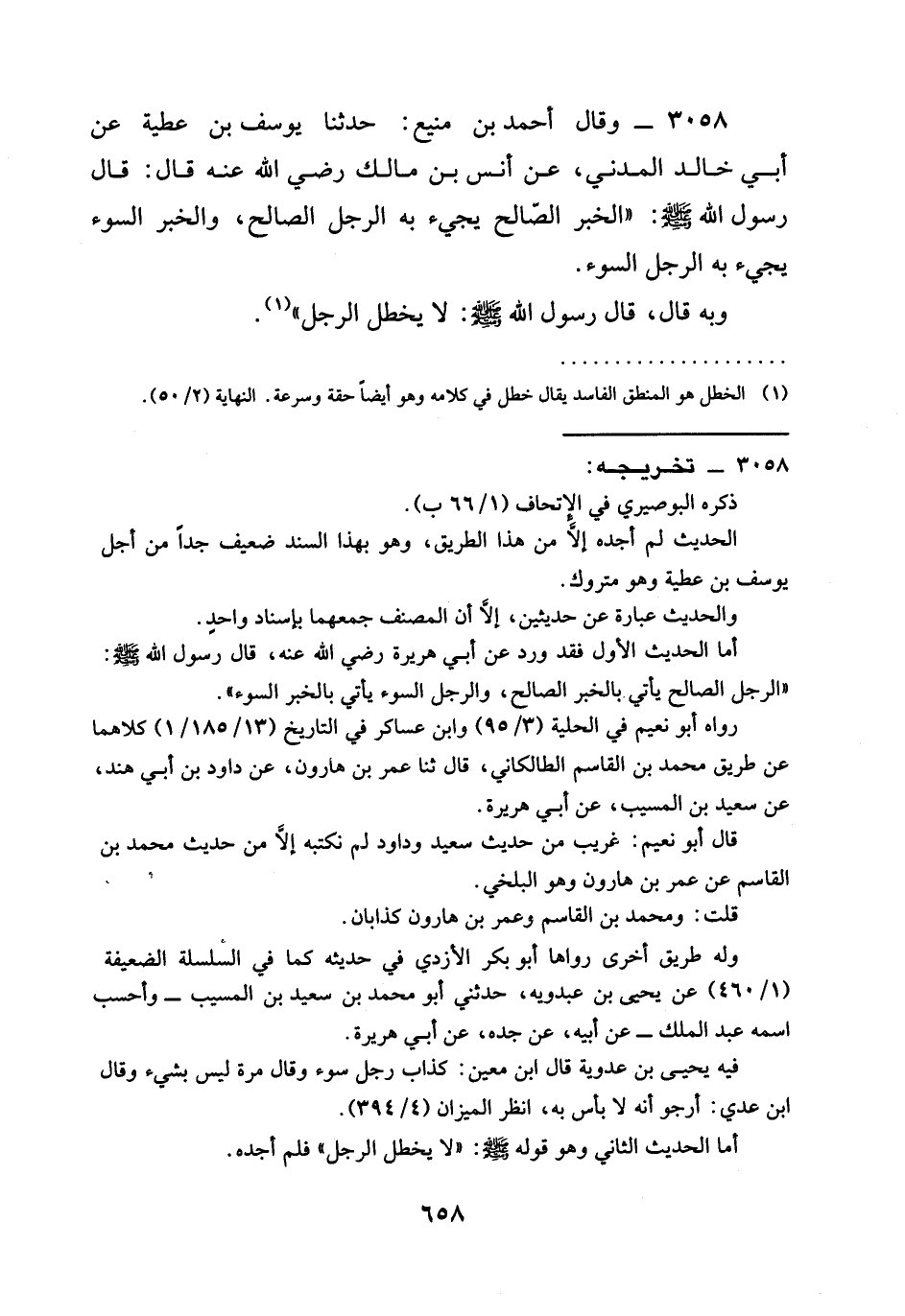 3058 - وَقَالَ أَحْمَدُ بْنُ مَنِيعٍ: حَدَّثَنَا يُوسُفُ بْنُ عَطِيَّةَ عَنْ أَبِي خَالِدٍ الْمَدَنِيِّ، عَنْ أَنَسِ بْنِ مَالِكٍ رَضِيَ الله عَنْهُ قَالَ: قَالَ رَسُولُ اللَّهِ صَلَّى اللَّهُ عَلَيْهِ وَسَلَّمَ: " §الْخَبَرُ الصَّالِحُ يَجِيءُ بِهِ الرَّجُلُ الصَّالِحُ، وَالْخَبَرُ السُّوءُ يَجِيءُ بِهِ الرَّجُلُ السُّوءُ.