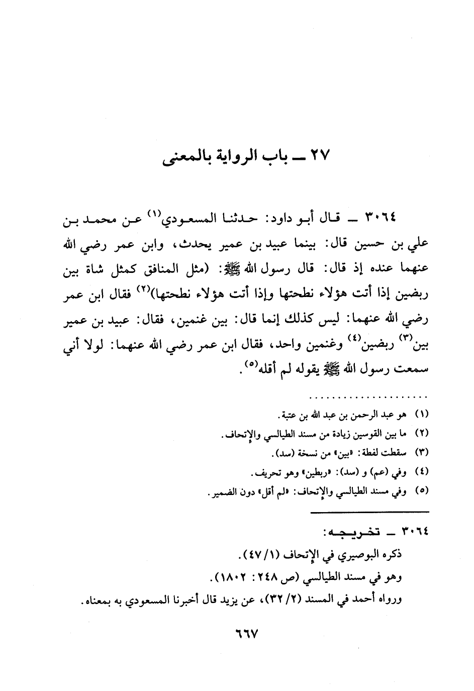 3064 - قال أَبُو دَاوُدَ: حدثنا الْمَسْعُودِيُّ، عَنْ مُحَمَّدِ بْنِ عَلِيِّ بْنِ حسين قال: بَيْنَمَا عُبَيْدُ بْنُ عُمَيْرٍ يُحَدِّثُ، وابن عمر رَضِيَ الله عَنْهما عِنْدَهُ إِذْ قَالَ: قَالَ رَسُولُ اللَّهِ صَلَّى اللَّهُ عَلَيْهِ وَسَلَّمَ: (مثل المنافق كمثل شَاةٍ بَيْنَ ربضين إذا أتت هؤلاء نطحتها وإذا أتت هؤلاء نطحتها) فَقَالَ ابن عمر رَضِيَ الله عَنْهما: §لَيْسَ كَذَلِكَ إِنَّمَا قَالَ: بَيْنَ غَنَمَيْنِ، فَقَالَ: عُبَيْدُ بْنُ عُمَيْرٍ بَيْنَ ربضين وَغَنَمَيْنِ وَاحِدٌ، فَقَالَ ابن عمر رَضِيَ الله عَنْهما، لَوْلَا أَنِّي سَمِعْتُ رَسُولَ اللَّهِ صَلَّى اللَّهُ عَلَيْهِ وَسَلَّمَ يَقُولُهُ لَمْ أَقُلْهُ.