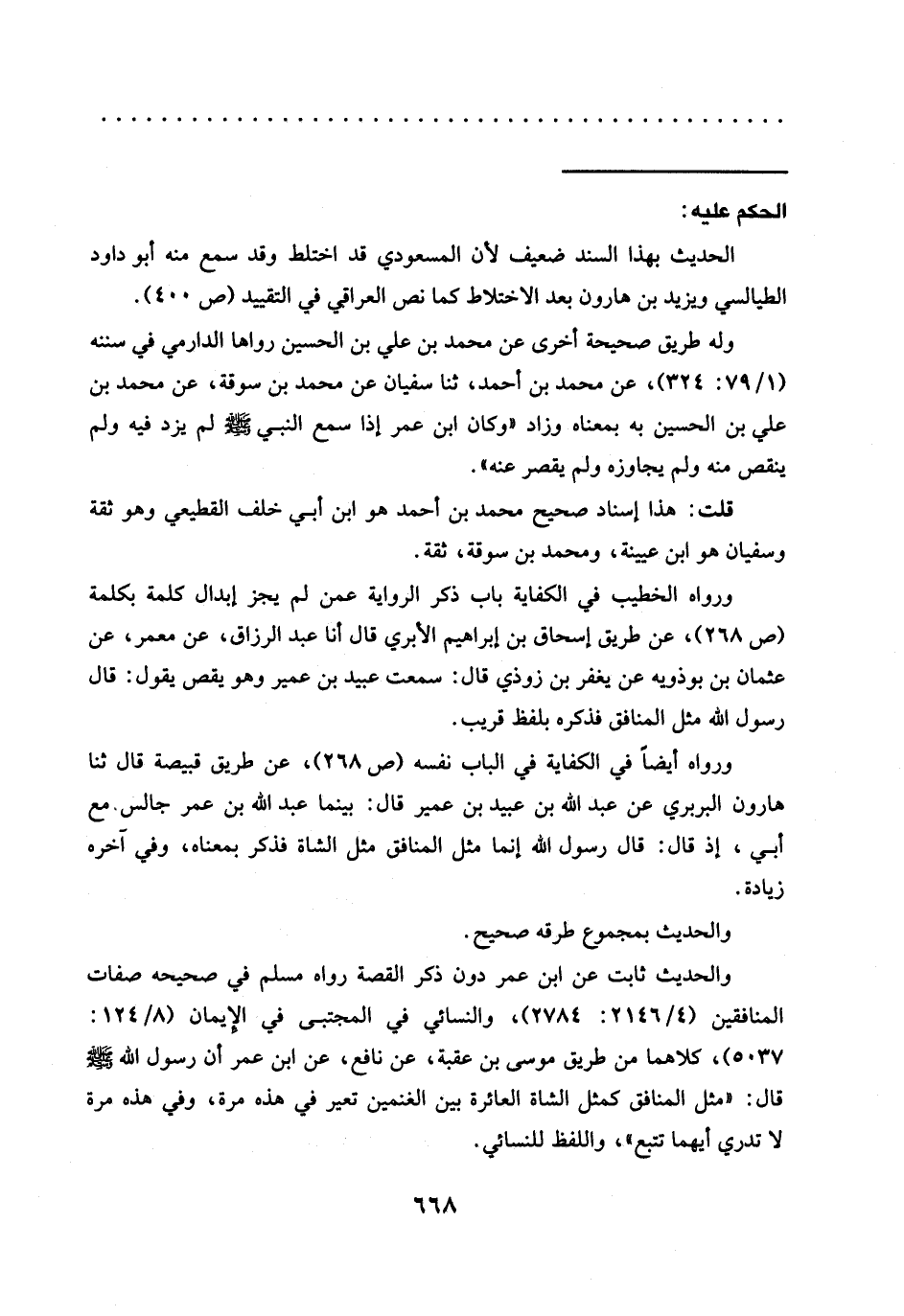 ورواه أيضًا في الكفاية في الباب نفسه (ص 268)، عن طريق قبيصة قال ثنا هَارُونَ الْبَرْبَرِيِّ عَنْ عَبْدِ اللَّهِ بْنِ عُبَيْدِ بن عمير قال: بينما عبد الله بن عمر جالس. مع أبي، إذ قال: قال رسول الله إنما مثل المنافق مثل الشاة فذكر بمعناه، وفي آخره زيادة.