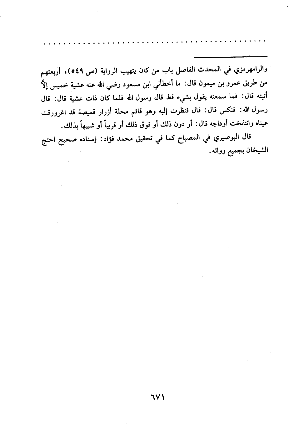 = والرامهرمزي في المحدث الفاصل باب من كان يتهيب الرواية (ص 549)، أربعتهم من طريق عمرو بن ميمون قال: ما أخطأني ابن مسعود رضي الله عنه عشية خميس إلّا أتيته قال: فما سمعته يقول بشيء قط قال رسول الله فلما كان ذات عشية قال: قال رسول الله: فنكس قال: قال فنظرت إليه وهو قائم محلة أزرار قميصة قد اغرورقت عيناه وانتفخت أوداجه قال: أو دون ذلك أو فوق ذلك أو قريبًا أو شبيهًا بذلك.