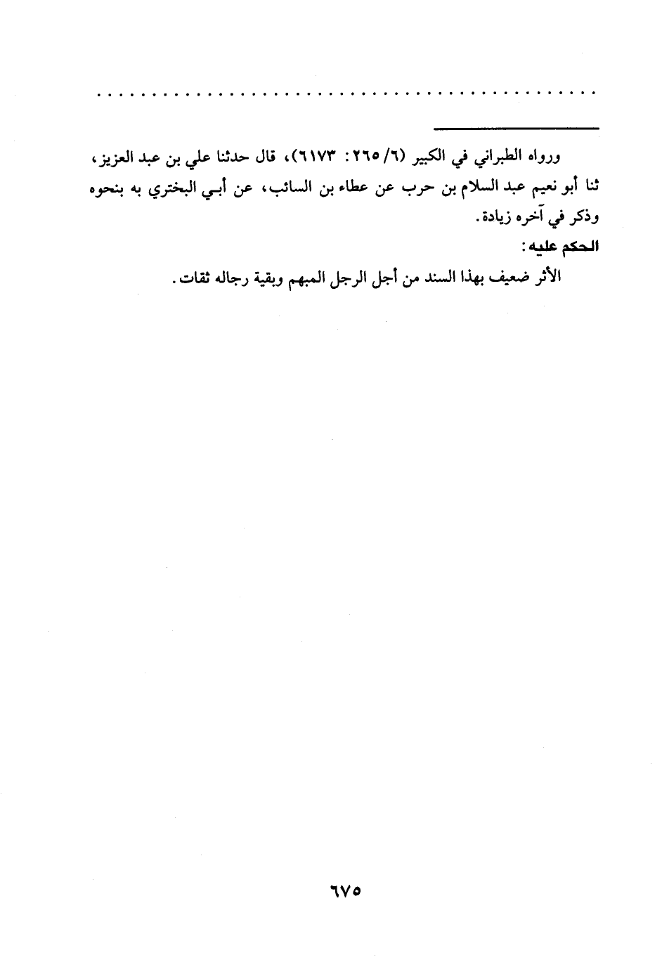 = ورواه الطبراني في الكبير (6/ 265: 6173)، قال حدّثنا علي بن عبد العزيز، ثنا أبو نعيم عَبْدُ السَّلَامِ بْنُ حَرْبٍ عَنْ عَطَاءِ بْنِ السائب، عن أبي البختري به بنحوه وذكر في آخره زيادة.