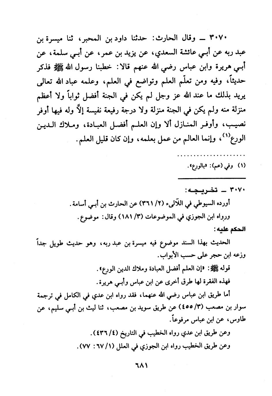 3070 - وقال الْحَارِثُ: حدثنا دَاوُدُ بْنُ الْمُحَبَّرِ، ثنا مَيْسَرَةُ بْنُ عَبْدِ رَبِّهِ عَنْ أبي عائشة السعدي، عَنْ يزيد بن عمر، عَنْ أَبِي سَلَمَةَ، عَنْ أَبِي هُرَيْرَةَ وابن عباس رَضِيَ الله عَنْهم قَالَا: خَطَبَنَا رَسُولُ اللَّهِ صَلَّى اللَّهُ عَلَيْهِ وَسَلَّمَ فَذَكَرَ حَدِيثًا، وَفِيهِ §وَمَنْ تَعَلَّمَ الْعِلْمَ وَتَوَاضَعَ فِي الْعِلْمِ، وَعَلَّمَهُ عباد الله تعالى يُرِيدُ بِذَلِكَ مَا عند الله عز وجل لَمْ يَكُنْ فِي الْجَنَّةِ أَفْضَلُ ثَوَابًا وَلَا أَعْظَمُ مَنْزِلَةً مِنْهُ وَلَمْ يَكُنْ فِي الْجَنَّةِ منزلاً وَلَا دَرَجَةٌ رَفِيعَةٌ نفسية إلا وله فيها أَوْفَرُ نَصِيبٌ، وَأَوْفَرُ الْمَنَازِلِ أَلَا وَإِنَّ الْعِلْمَ أَفْضَلُ الْعِبَادَةِ، وَمِلَاكُ الدِّينِ الورع، وَإِنَّمَا العالم من عمل بعلمه، وَإِنْ كَانَ قَلِيلَ الْعِلْمِ.