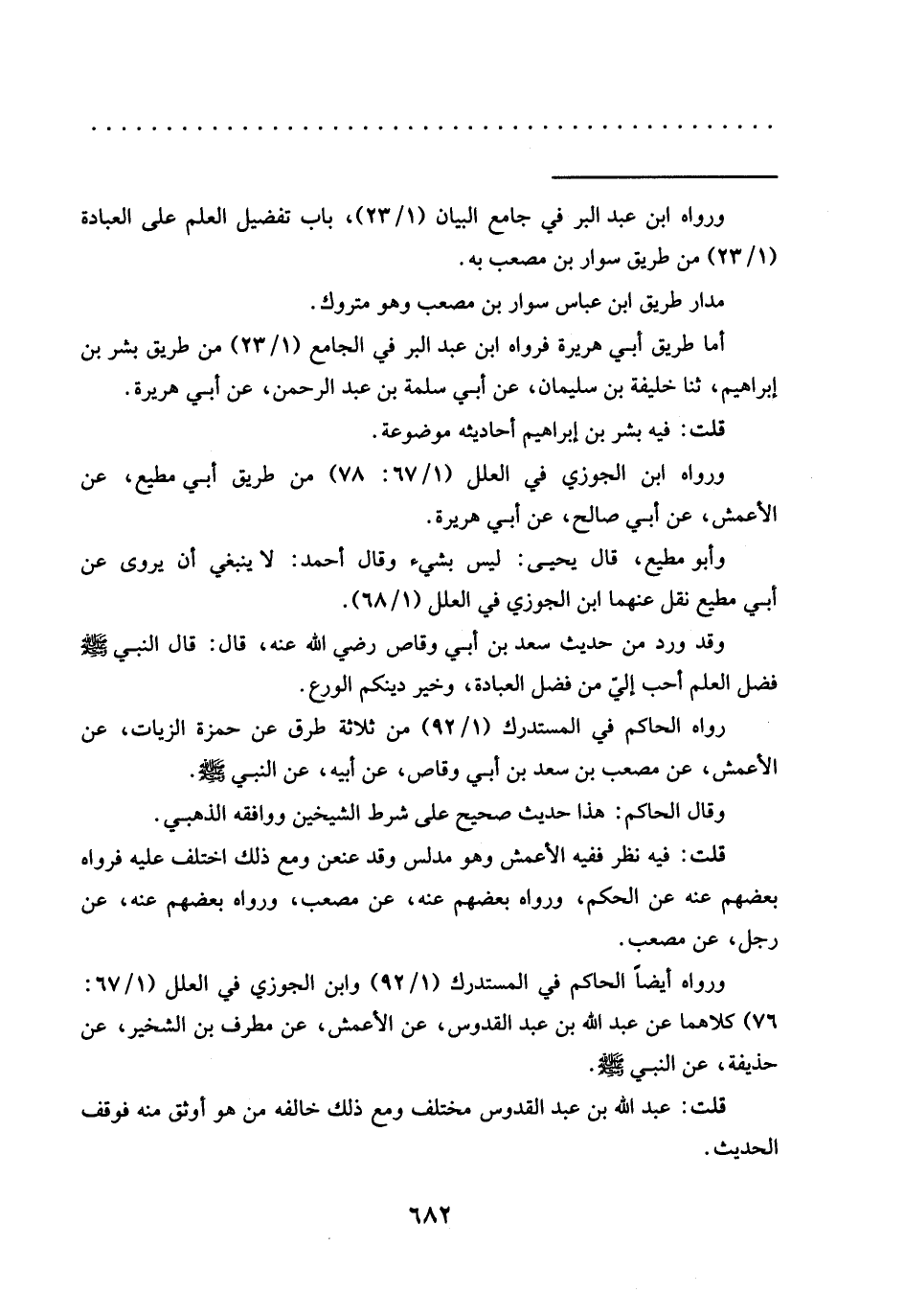 = ورواه ابن عبد البر في جامع البيان (1/ 23)، باب تفضيل العلم على العبادة (1/ 23) من طريق سوار بن مصعب به.