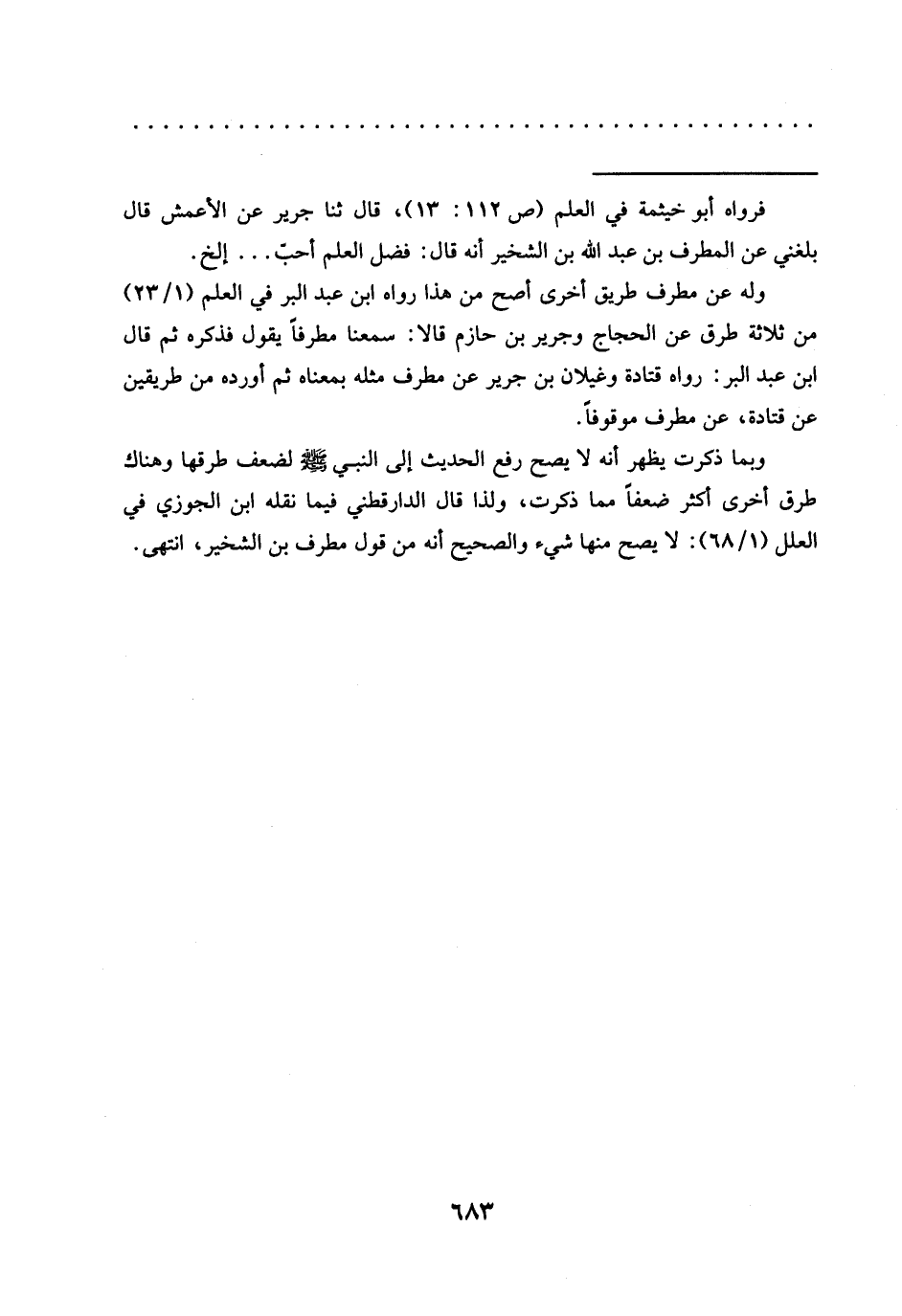 وله عن مطرف طريق أخرى أصح من هذا رواه ابن عبد البر في العلم (1/ 23) من ثلاثة طرق عن الحجاج وجرير بن حازم قالا: سمعنا مطرفًا يقول فذكره ثم قال ابن عبد البر: رواه قتادة وغيلان بن جرير عن مطرف مثله بمعناه ثم أورده من طريقين عن قتادة، عن مطرف موقوفًا.