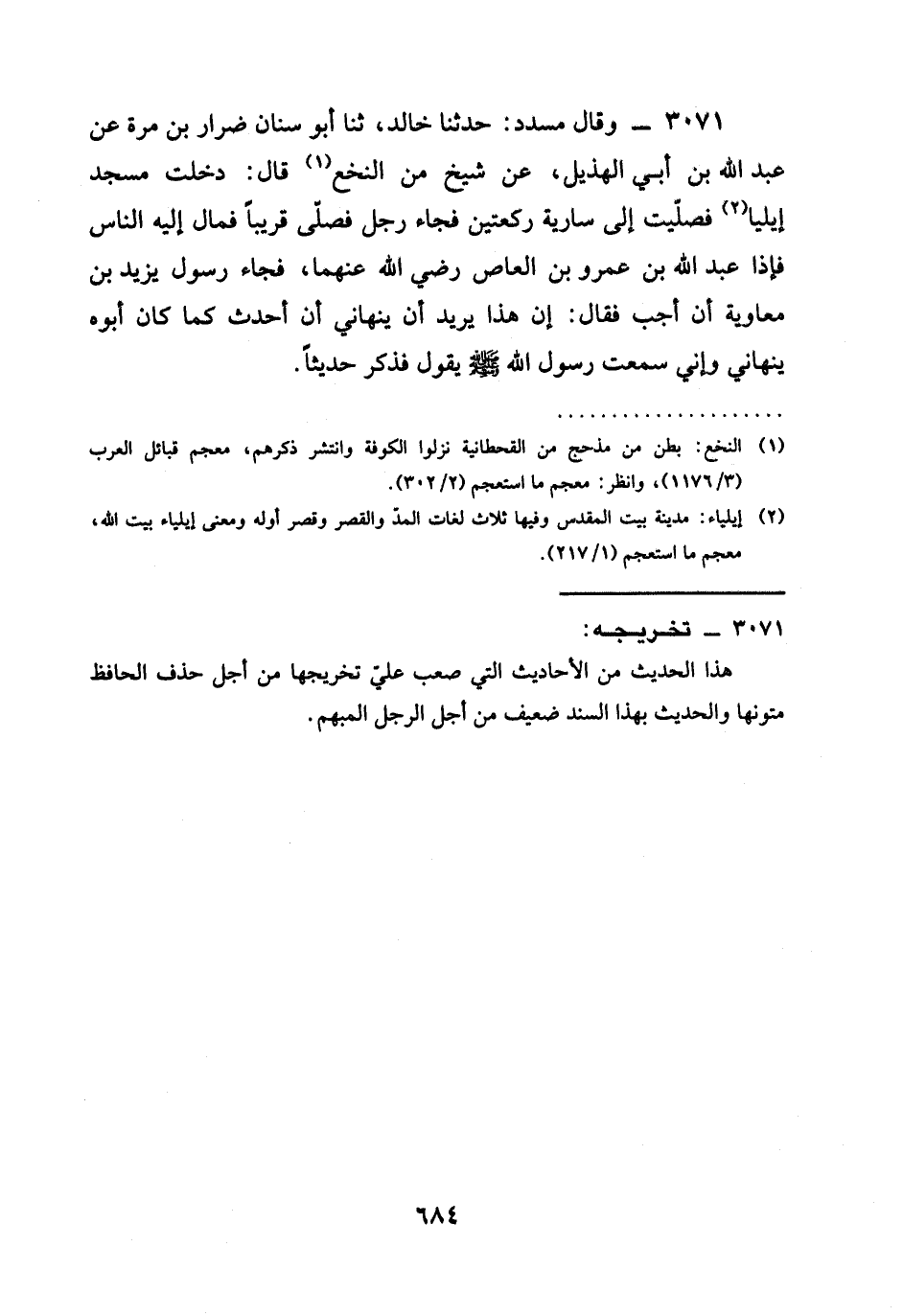 3071 - وقال مسدد: حدثنا خالد، ثنا أَبُو سِنَانٍ ضِرَارُ بْنُ مُرَّةَ عَنْ عَبْدِ اللَّهِ بْنِ أَبِي الْهُذَيْلِ، عَنْ شيخ من النخع قَالَ: دَخَلْتُ مَسْجِدَ إيليا فَصَلَّيْتُ إِلَى سَارِيَةٍ رَكْعَتَيْنِ فَجَاءَ رَجُلٌ فَصَلَّى قَرِيبًا فَمَالَ إليه الناس فإذا عَبْدُ اللَّهِ بْنُ عَمْرِو بن العاص رَضِيَ الله عَنْهما، فَجَاءَ رَسُولُ يَزِيدَ بْنِ مُعَاوِيَةَ أَنْ أَجِبْ فَقَالَ: إِنَّ §هَذَا يُرِيدُ أَنْ يَنْهَانِي أَنْ أُحَدِّثَ كَمَا كَانَ أبوه ينهاني وإني سَمِعْتُ رسول الله صَلَّى اللَّهُ عَلَيْهِ وَسَلَّمَ يقول فَذَكَرَ حَدِيثًا.