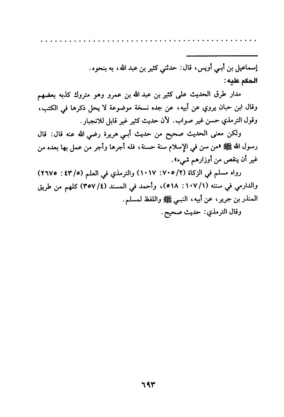 رواه مسلم في الزكاة (2/ 705: 1017) والترمذي في العلم (5/ 43: 2675) والدارميُّ في سننه (1/ 107: 518)، وأحمد في المسند (4/ 357) كلهم من طريق المنذر بن جرير، عن أبيه، النبي -صلى الله عليه وسلم- واللفظ لمسلم.