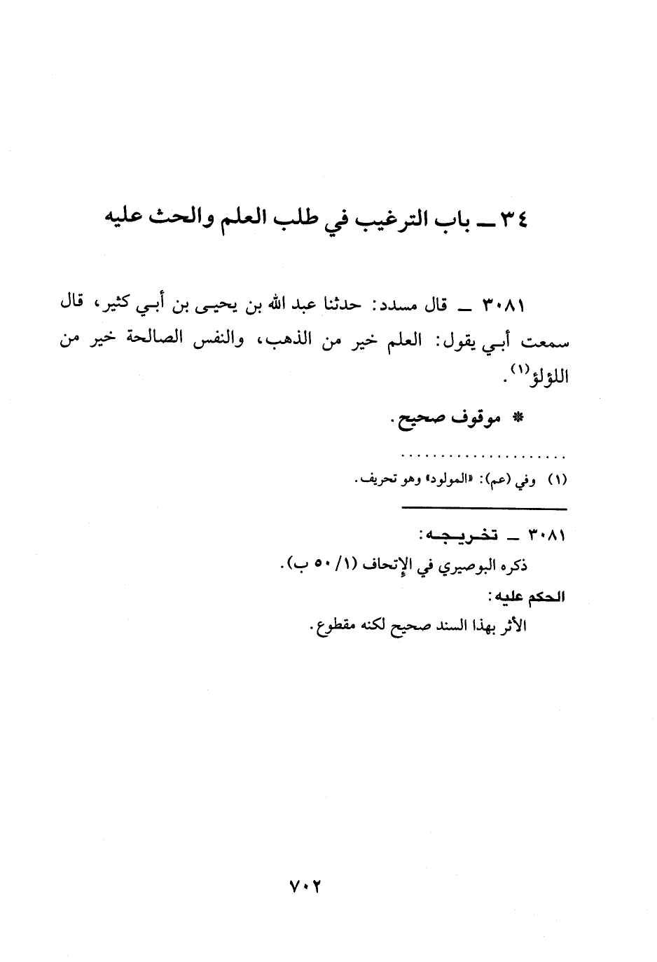 3081 - قَالَ مُسَدَّدٌ: حدثنا عَبْدُ الله بن يَحْيَى بْنُ أبي كثير، قال سَمِعْتُ أَبِي يَقُولُ: §الْعِلْمُ خَيْرٌ مِنَ الذَّهَبِ، وَالنَّفْسُ الصَّالِحَةُ خَيْرٌ مِنَ اللُّؤْلُؤِ.
