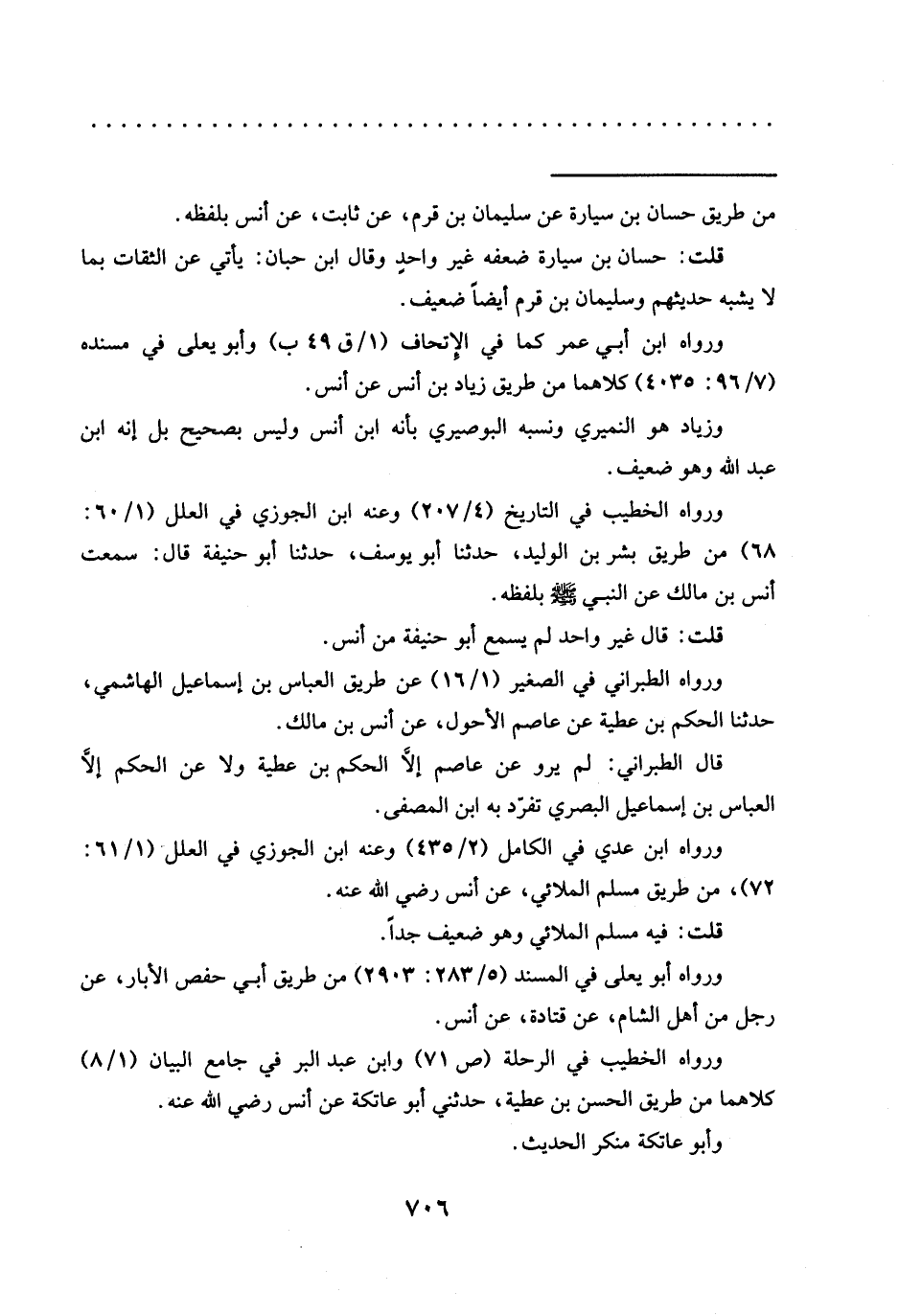 ورواه الخطيب في الرحلة (ص 71) وابن عبد البر في جامع البيان (1/ 8) كلاهما من طريق الحسن بن عطية، حدثني أبو عاتكة عن أنس رضي الله عنه.